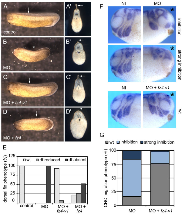 Figure 3. Fz4-v1 function is required for dorsal fin development. (A-D) Embryos were injected at the 2- to 4-cell stage with 50 ng antisense Fz4/Fz4-v1 morpholino oligonucleotide (MO) alone (B, B’) (n = 10), or in combination with 500 pg fz4-v1 RNA (C, C’) (n = 29) or 500 pg fz4 RNA (D, D’) (n = 23). At the tailbud stage (st. 30) formation of the dorsal fin was compared to uninjected control embryos (A, A’) (n = 40). (A’-D’) Vibratome cross-sections of the embryos shown in A-D. White arrows indicate the dorsal fin. (E) Quantification of the experiment. (df) dorsal fin. (F)in situ hybridization for sox10 and twist mRNA in tailbud-stage embryos (st. 32) injected unilaterally with Fz4/Fz4-v1 MO or the combination of MO and fz4-v1 RNA. Asterices indicate the injected side of the embryos. (NI) non-injected side of the embryo, (wt) wild-type embryos. (G) Quantification of the CNC phenotypes.