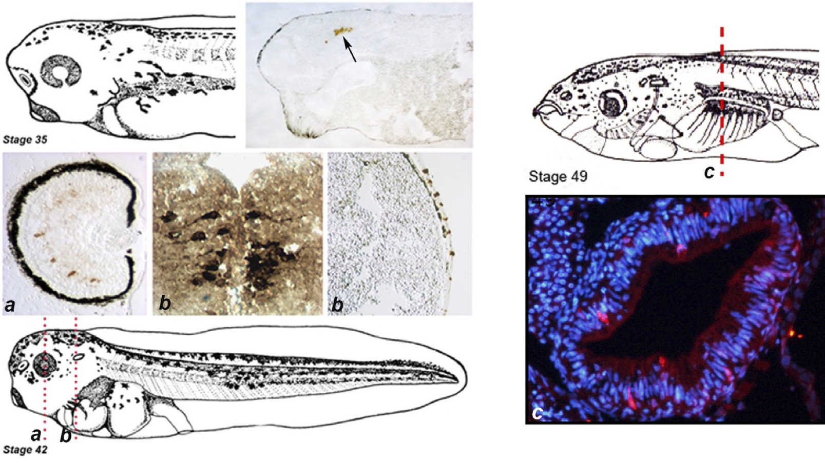 Fig. 3. Visualization of serotonergic cells during Xenopus embryogenesis. Distribution of serotonergic cells in Xenopus larvae, as detected in cryostat sections by immunostaining with an anti-serotonin antibody. Left panel, upper row: sagittal section of a late tailbud (stage 35) larva showing serotonin cells in the raphe nuclei (arrow); middle row, from left to right: serotonergic cells are found in the retina (amacrine cells), in the raphe nuclei, and in the skin of a late tailbud (stage 42) larva. Right panel: coronal section showing serotonin cells detected in the gut of a stage 49tadpole (red fluorescence). Coronal planes are indicated as a, b, c.