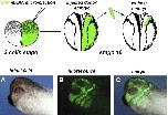 Fig. 2. Neural crest cell transplantation assay. Top: Scheme of the cranial NCCs transplant assay at neurula stage (st. 16). (A,B,C) Lateral views of an early tailbud (stage 28) transplanted embryo: (A) bright field; (B) GFP fluorescence in transplanted cranial NCCs; (C) merge.