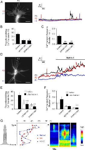 Figure 4. STIM1/TRPC1-dependent SOCE mediates the spontaneous and netrin-1-potentiated filopodial Ca2+ entries. (A) Left panel; a Lck-GCaMP3 fluorescent Ca2+ image of a Xenopus spinal growth cone showing three ROIs (F1, F2 and F3) encompassing the filopodia used to measure fluorescent intensities over time (right panels). Scale bar, 10 μm. The incidence (B) and the frequency (C) of the spontaneous filopodial Ca2+ transients were significantly attenuated by XSTIM1-DN (n = 30) or XTRPC1-MO (n = 30), when compared to the control (n=34; *P < 0.001 and **p < 0.005, Studentâs t-test). Values represent mean ± s.e.m. (D) A Lck-GCaMP3 fluorescent Ca2+ image of a growth cone showing three ROIs (left panel) and their representative traces of Ca2+ signals in three filopodia (F1, F2, F3) before and after bath application of netrin-1 (10 ng/ml) (right panel) in the presence of Sp-cAMP (25 μM). Scale bar, 10 μm. (E-F) Netrin-1 potentiated the incidence (E) and the frequency (F) of filopodial Ca2+ transients in spinal growth cones (control; n = 14) and this potentiation was abolished by XSTIM1-DN (n = 8) and XTRPC1-MO (n = 10). **P < 0.005 and ***p < 0.05 (Studentâs t-test). Values represent mean ± s.e.m. (G) Filopodia tips are the major site of initiation of filopodial Ca2+ entry as revealed by kymographs of Ca2+ signals in filopodia using Lck-GCaMP3 in modified Ringers saline (MR; n = 67), netrin-1 exposure (n = 27) and Ca2+ re-addition after depletion (SOCE; n = 43). The y axis represents the path distance along the filopodia divided into 10 portions and the x axis represents time. The arrows denote the tip and base of filopodia. |