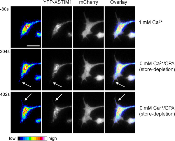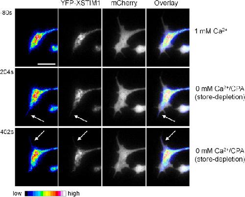 Figure 5. Dynamic translocation of STIM1 into neuronal filopodia in response to store-depletion. Representative time-lapse fluorescent images of growth cone expressing YFP-XSTIM1 before (1 mM Ca2+) and after store Ca2+ depletion (0 mM Ca2+/CPA). mCherry was co-expressed to mark filopodia and growth cone. Images were pseudocolored to enhance the observation of intensity changes. The arrows indicate newly translocated XSTIM1 proteins into neuronal filopodia. Scale bars: 10 μm. |