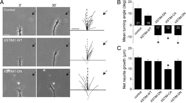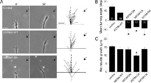 Figure 6. XSTIM1 is required for attractive turning responses of neuronal growth cones to a netrin-1 gradient. (A) Sample images of growth cone turning responses in a gradient of netrin-1 of a control Xenopus spinal neuron, and neurons derived from embryos injected with mRNA encoding wild-type (YFP-XSTIM1-WT), or dominant negative mutant (YFP-XSTIM1-DN). The left two columns of images show neuronal growth cones at the start (0 min) and the end of exposure (30 min) to a netrin-1 gradient (5 μg/ml in the pipette). The right column shows superimposed trajectories of neurite extension during the 30' period for a sample population of 12 neurons under the each condition. The origin is the center of the growth cone and the original direction of growth is vertical. Arrows indicate the direction of the gradient. Scale bars: 10 μm. (B) Summary of mean turning angles of growth cones in responses to a gradient of netrin-1 under different conditions. The number associated with the bar graph indicates the number of growth cones analyzed. Values represent meanâ±âs.e.m. (* indicates Pâ<â0.01; Bootstrap-test). (C) Summary of net neurite growth during the 30 minutes turning assay under different conditions. Values represent meanâ±âs.e.m. (* indicates Pâ<â0.05; Bootstrap-test). |