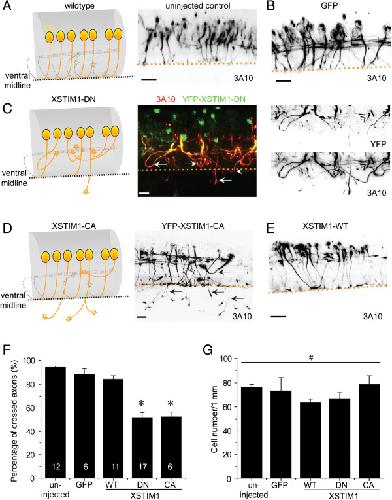 Figure 7. XSTIM1 is required for midline axon guidance of commissural interneurons in the developing Xenopus spinal cord. (A-E) Sample images of the sagittal view of commissural interneurons and their axonal projections in the Xenopus spinal cord from stage 25-26 embryos. Shown are schematic diagrams and confocal z-stack projection images of 3A10 staining of commissural interneuron axons from uninjected embryos, or embryos injected with mRNAs for GFP (B), YFP-XSTIM1-DN (C), YFP-XSTIM1-CA (D), or YFP-XSTIM1-WT (E), at the two to four cell-stage to manipulate a sub-population of neurons. Dotted line represents ventral midline; arrows point to mis-targeted axons. Scale bars: 20 μm. (F) Quantification of the percentage of 3A10+ commissural interneurons with normal midline crossing under different experimental conditions. The number associated with the bar graph indicates the number of embryos examined under each condition. Values represent meanâ±âs.e.m. (* indicates Pâ<â0.01; Bootstrap-test). (G) Summary of the density of 3A10+ commissural neurons under each condition. The same embryos as in (F) were examined. Values represent meanâ±âs.e.m. (# indicates Pâ>â0.1; Bootstrap-test). |