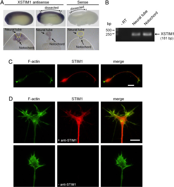 Figure 1. Xenopus STIM1 is expressed in developing neural tissues and neuronal growth cones. (A) Sample images of whole-mount (top) and cross-section (bottom) in situ hybridization analysis of the mRNA expression of XSTIM1 in developing Xenopus embryos. Left, antisense; right, sense probe. Dotted lines delineate the boundaries of neural tube and notochord. (B) RT-PCR detection of XSTIM1 mRNA from RNA samples extracted from state 25-26 Xenopus neural tube and notochord tissues. âRT lane is the negative control of the RT-PCR on neural tube tissue RNA in the absence of a reverese transcriptase. (C) Representative immunofluorescence images of cultured Xenopus spinal neurons labeled for STIM1 (red) and F-actin (phalloidin: green). Scale bar: 20 μm. (D) Representative immunofluorescence images of growth cones labeled for STIM1 (red) and F-actin (green). Negative control processed without STIM1 antibody (without STIM1, bottom) shows absence of immunolabeling. Scale bar: 10 μm. |