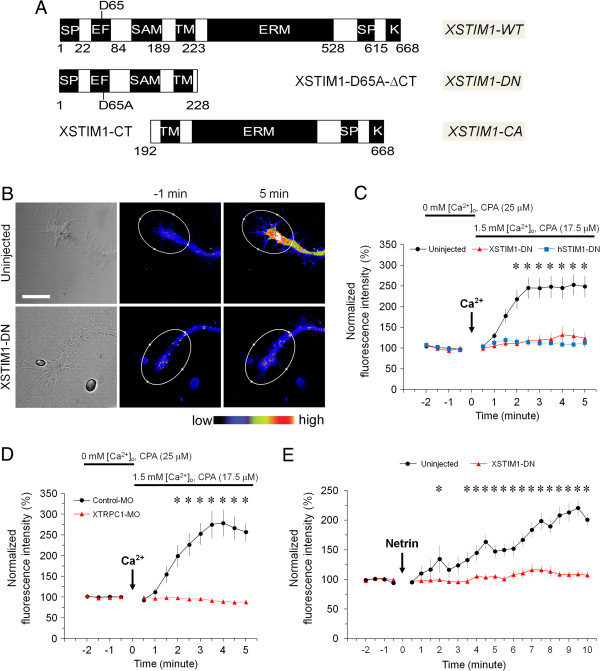 Figure 2. STIM1-dependent SOCE operates and mediates netrin-1-induced Ca2+ elevation in Xenopus neuronal growth cones. (A) A schematic diagram of full-length wild-type (WT) and mutant constructs of XSTIM1. (B) Bright field and pseudocolor images of fluo-4 fluorescence of growth cones of Xenopus spinal neurons from the uninjected or mcherry-XSTIM1-DN injected embryos in the presence of CPA in Ca2+-free media, before and after the re-addition of 1.5 mM Ca2+ bath solution. Pseudocolors indicate Ca2+ levels, with white as the highest and black as the lowest. Scale bar: 10 μm. (C) Summary of internal Ca2+ store depletion-induced Ca2+ entry in growth cones at different time points before and after re-addition of 1.5 mM Ca2+. The fluorescence intensity was normalized to the average fluorescence intensity of 2 min baseline levels prior to Ca2+ re-addition. Values represent meanâ±âs.e.m. (nâ=â25 for control, nâ=â10 for XSTIM1-DN and nâ=â19 for hSTIM1-DN; * indicates Pâ<â0.01; Bootstrap-test). (D) XTRPC1 is required for store depletion-evoked Ca2+ entry in neuronal growth cones. Summary of internal Ca2+ store depletion-induced Ca2+ entry in growth cones from the control-MO or XTRPC1-MO injected embryos at different time points before and after the re-addition of 1.5 mM Ca2+. Values represent meanâ±âs.e.m. (nâ=â12 for control, and nâ=â13 for XTRPC1-MO; * indicates Pâ<â0.01; Bootstrap-test). (E) XSTIM1 is required for netrin-1-induced Ca2+ elevation in growth cone. Summary of time course of Ca2+ changes in neuronal growth cones from uninjected or mCherry-XSTIM1-DN mRNA injected embryos. The fluorescence intensity was normalized to the average fluorescence intensity of 2 min baseline levels prior to the netrin-1 application (10 ng/ml). Values represent meanâ±âs.e.m. (nâ=â6 for control and nâ=â9 for XSTIM1-DN; * indicates Pâ<â0.05; Bootstrap-test). |