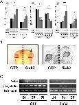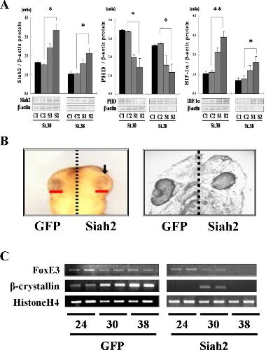 Fig. 2. Effects of xSiah2 mRNA injection on the accumulation of xSiah2, xPHD, and xHIF-1α, eye phenotype, and lens marker transcription. (A) In C1 embryos, synthesized mRNA was not injected; in C2 embryos, GFP mRNA was injected into both dorsal blastomeres at the two-cell stage; in S1 embryos, GFP mRNA was injected into one dorsal blastomere, and Siah2 mRNA into another dorsal blastomere at the two-cell stage; and in S2 embryos, xSiah2 mRNA was injected into both dorsal blastomeres at the two-cell stage. The expression levels of xSiah2, xPHD, and xHIF-1α at st. 30 and 38 were investigated in these embryos by western blotting. The values in the graphs represent the mean ± SD of three experiments. *p < 0.05, **p < 0.01 vs. C2 embryos (B) GFP or xSiah2 mRNA was injected into each dorsal blastomere at the two-cell stage. Comparison of anterior views of the head between the sides of the same embryo injected with GFP mRNA (GFP) and xSiah2 mRNA (Siah2) at st. 30. Arrow indicates the thickened lens ectoderm. Histological difference between the sides of the same embryo injected with GFP mRNA (GFP) and xSiah2 mRNA (Siah2) at st. 38. (C) GFP (GFP) or xSiah2 mRNA (Siah2) was injected into both dorsal blastomeres at the two-cell stage. The transcriptional levels of FoxE3 and β-crystallin at st. 24, 30, and 38 were investigated in these embryos by RT-PCR.
