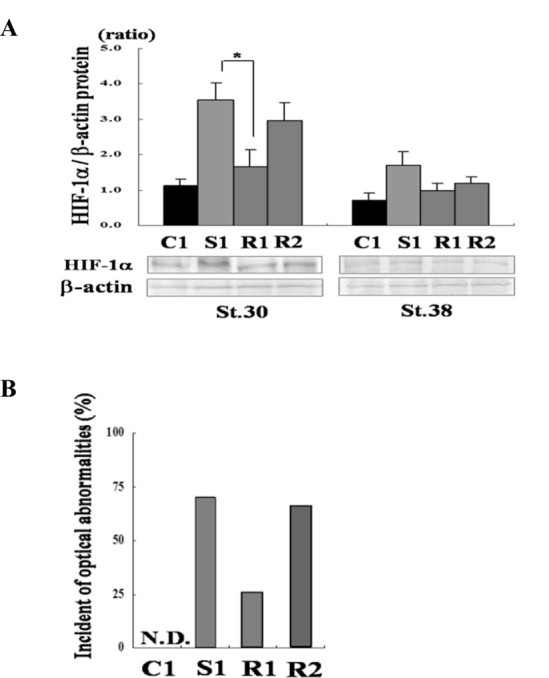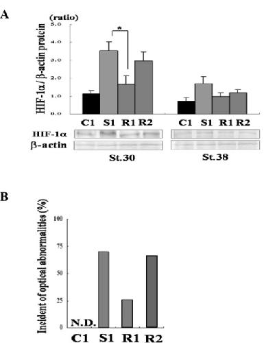 Fig. 3. Effect of resveratrol on the small eye phenotype. (A and B) In the C1 treatment group, GFP mRNA was injected into both dorsal blastomeres at the two-cell stage. In the S1, R1, and R2 treatment groups, xSiah2 mRNA was injected into both dorsal blastomeres at the two-cell stage. Embryos were exposed to resveratrol (40 μM) from st. 12 to 38 in R1 treatment group and from st. 22 to 38 in the R2 treatment group. (A) The expression levels of xHIF-1α at st. 30 and 38 were investigated in these embryos by western blotting. The values in the graph represent the mean ± SD of three experiments. *p < 0.05 vs. S1 treatment group. (B) Percentages of embryos with optical malformations in each treatment group at st. 38. N.D., not detected.