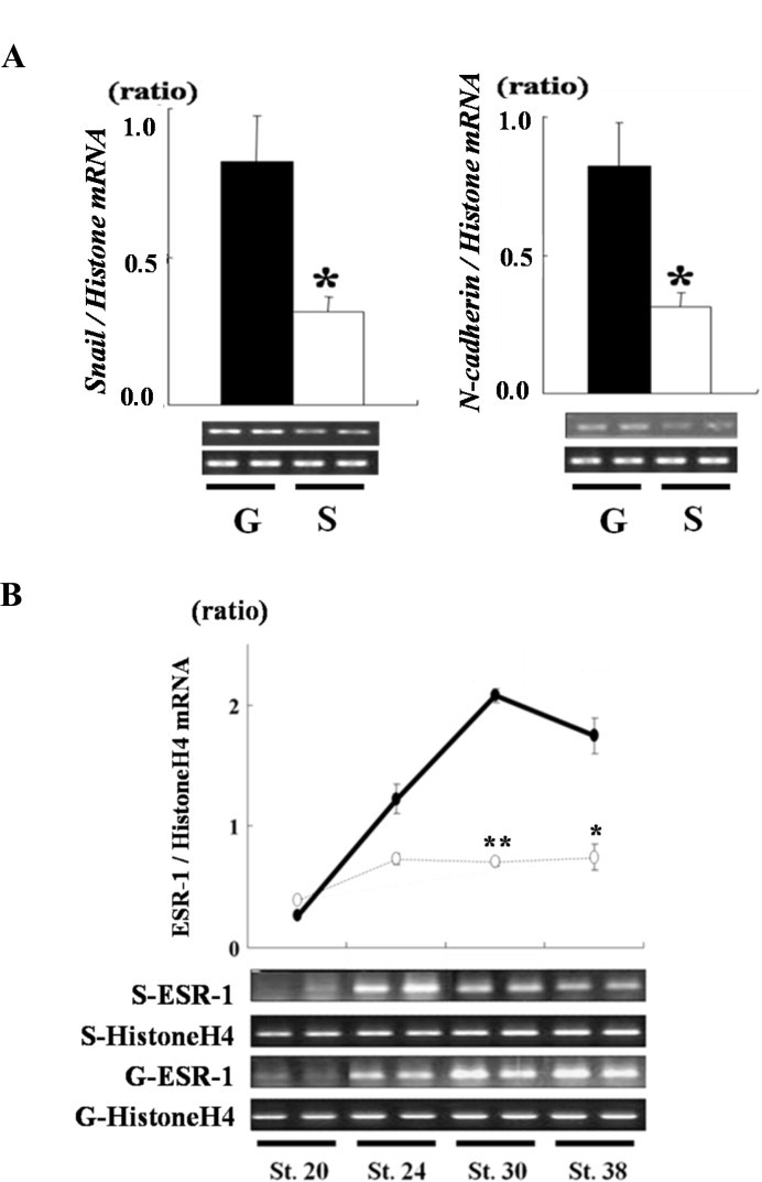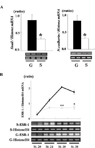 Fig. 4. Effect of xSiah2 mRNA injection on transcriptional levels of Notch signaling-responsive genes. (A and B) GFP or xSiah2 mRNA was injected into both dorsal blastomeres at the two-cell stage. (A) The transcriptional levels of Snail-1 and N-cadherin mRNAs at st. 30 were investigated in the embryos by RT-PCR. Black and white bars indicate the transcriptional levels in GFP mRNA injected embryos (G) and xSiah2 mRNA injected embryos (S), respectively. The values in the graphs represent the means ± SD of three experiments. *p < 0.05 vs. GFP mRNA-injected embryos (B) The transcriptional levels of ESR-1 mRNA at st. 20, 24, 30, and 38 were investigated by RT-PCR. Closed and open circles indicate the transcriptional levels of ESR-1 mRNA in GFP mRNA-injected embryos and xSiah2 mRNA-injected embryos, respectively. The values in the graph represent the means ± SD of three experiments. *p < 0.05, **p < 0.01 vs. GFP mRNA-injected embryos.