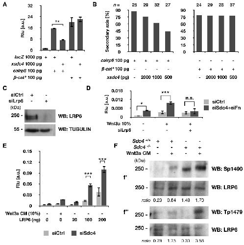 Fig. 4. Syndecan-4 inhibits Wnt/-catenin signaling at the LRP6 level. (A) Constitutive active LRP6 (calrp6) and constitutive active -catenin (ˇ-cat*) mRNAs were coinjectedwith lacZ (as a control) or xsdc4 as indicated, and Wnt/-catenin signaling was evaluated by TOPFlash assay. **p < 0.01, by one-way ANOVA followed by Tukey post hoc test.(B) Secondary axes were induced in Xenopus by injection of calrp6 or ˇ-cat* mRNAs in one ventral vegetal blastomere at the 4-cell stage. xsdc4 coinjection reduced secondaryaxis (secondary axis, [%]) induction by calrp6 by half; however, secondary axis formation induced by ˇ-cat* was not affected by xsdc4, even when ˇ-cat* was reduced torule out saturation of the system. n, number of embryos injected per treatment. (C and D) HeLa cells were cotransfected with a mixture of siSdc4 and siFn to potentiateWnt/-catenin signaling in response to Wnt3a. The knockdown of LRP6 using siRNA (siLrp6; C) completely abrogates this potentiation (D). *p < 0.05, ***p < 0.001, by two-wayANOVA followed by Bonferroni post hoc test; n.s., not significative. (E) HeLa cells were cotransfected with LRP6, which activates Wnt/-catenin signaling, and siCtrl or siSdc4.Knockdown of SDC4 increases LRP6 activity. ***p < 0.001, by two-way ANOVA followed by Bonferroni post hoc test. (F) MEFs from Sdc4 +/+ and Sdc4 −/− mice were stimulatedwith L-Cell CM or Wnt3a CM by 30 min, and then lysed and membrane-enriched fractions were prepared and separated by SDS-PAGE, and probed with anti phospho-LRP6antibodies to evaluate endogenous LRP6 phosphorylation. fand fcorrespond to two independent experiments. P-LRP6/LRP6 ratios are indicated for fand f. For TOPFlashassays, representative experiments are shown, and each experiment was performed at least n = 3. WB, Western Blot. |