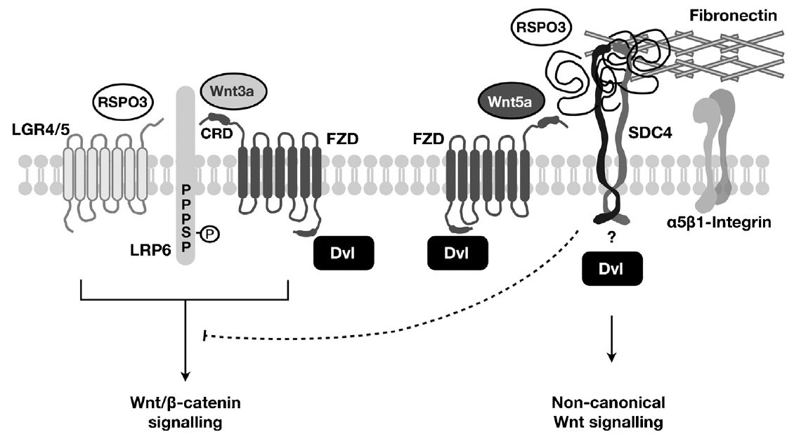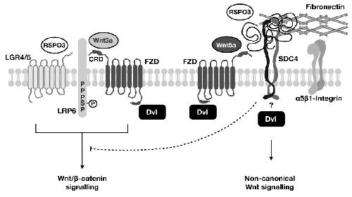 Fig. 6. Model for the regulation of Wnt signaling by SDC4. Wnt/-catenin signaling, initiated by Wnt ligands, relies on receptors (Frizzled, FZD) and co-receptors (LRP6) atthe plasma membrane, plus synergic activities of Rspo ligands, inducing LRP6 phosphorylation, by mechanisms mediated by Dishevelled and other cytoplasmic proteins.Non-canonical Wnt signaling mediated by Wnt ligands, such as Wnt5a, is initiated by plasma membrane components and through mechanisms involving also Frizzledreceptors and Dishevelled. SDC4 participates in this process, by interacting functionally with Dishevelled and Frizzled-7 (see Mu˜noz et al., 2006; Carvallo et al., 2010), andalso with RSPO3 (Ohkawara et al., 2011). It is likely that the participation of SDC4 may be related with adhesion proteins, such as Fibronectin and integrins; this may resultin titration of RSPO3, or competition with intracellular proteins, resulting in inhibition of the Wnt/-catenin signaling. |