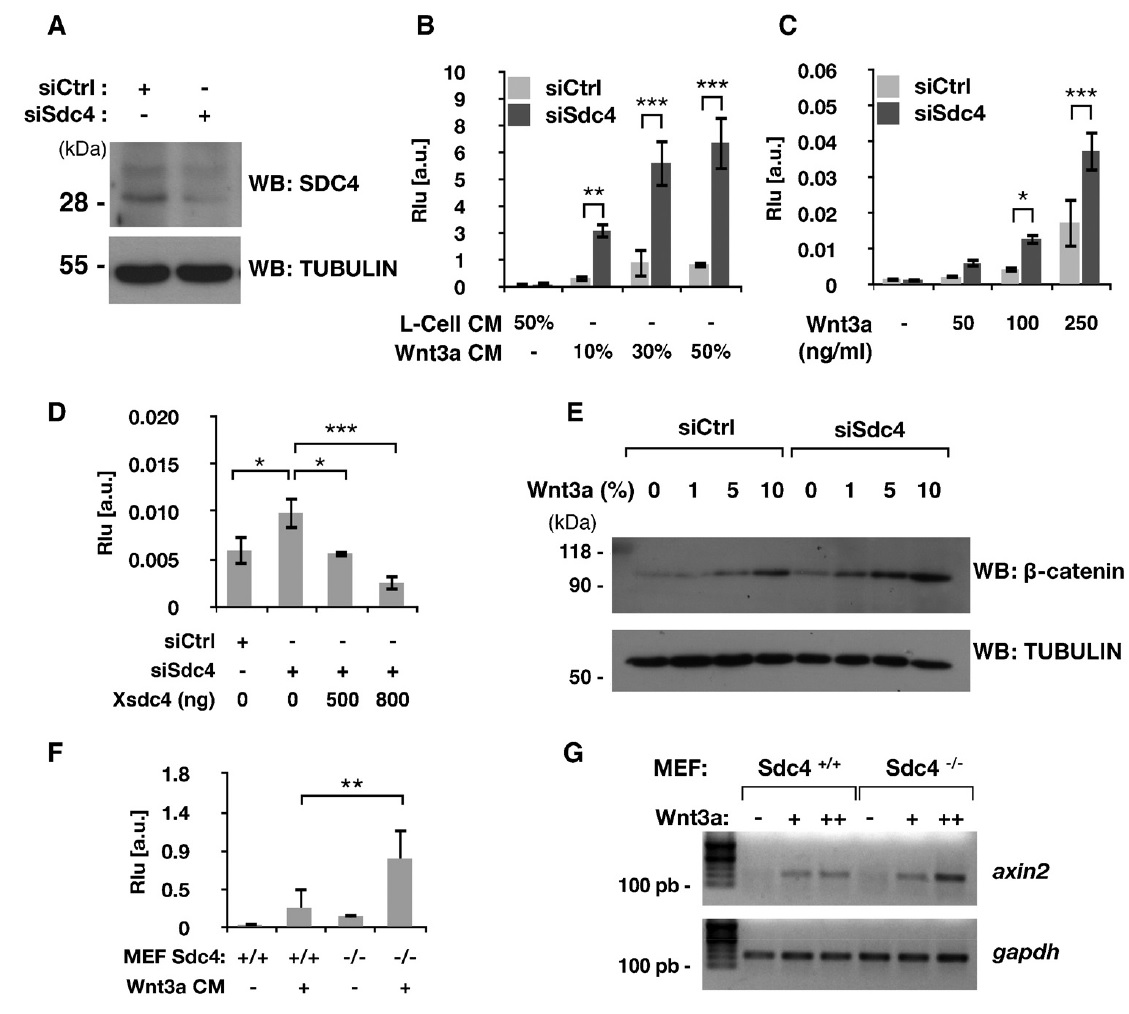Fig. 5. Enhanced canonical activity of R-spondin 3 (RSPO3) in response to SDC4 knockdown. (A) HEK293 cells were transfected with siSdc4 or control siRNA, and stimulatedwith low doses of Wnt3a CM and increasing concentrations of purified RSPO3. Knockdown of SDC4 increases the ability of RSPO3 to enhance Wnt/-catenin signaling. (B)L-Cells were transfected with siCtrl or siSdc4, and -catenin stabilization after 1 h of stimulation with Wnt3a CM, plus purified RSPO3 or vehicle, was visualized. (C) HEK293cells were co-transfected with Rspo3-Flag/HA (Rspo3-FH) and Lgr4-Flag/HA (Lgr4-FH) and the indicated siRNAs, and stimulated with low doses of Wnt3a CM. Knockdownof SDC4 enhances TOPFlash activity in response to RSPO3 plus LGR4. (D) Knockdown of the RSPO3 receptor, LGR4, abrogates the potentiation observed when SDC4 levelsare reduced. HEK293 cells were transfected as indicated, and stimulated with low doses of Wnt3a CM and increasing concentrations of purified RSPO3. *p < 0.05; **p < 0.01;***p < 0.001, by two-way ANOVA followed by Bonferroni post hoc test; WB, Western Blot. |