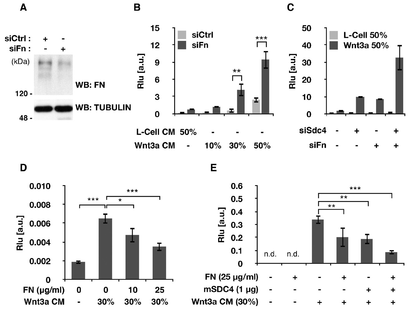 Fig. 3. Fibronectin (FN) loss-of-function enhances Wnt/-catenin signaling. (A and B) FN knockdown using siRNA (siFn; A) enhances TOPFlash activity in response to increasingconcentrations of Wnt3a CM (B). **p < 0.01, ***p < 0.001, by two-way ANOVA followed by Bonferroni post hoc test (B). (C) siFn and siSdc4 have a cooperative effect on TOPFlashactivity, compared with each siRNA transfected separately, in HEK293 cells. (D) Culture of cells upon recombinant FN decreases Wnt/-catenin signaling; in HeLa cells in aconcentration-dependent manner. *p < 0.05, ***p < 0.001, by one-way ANOVA followed by Tukey post hoc test. (E) MEFs from Sdc4 −/− mice were stimulated with Wnt3a CMand treated as indicated. Both culture of MEFs upon recombinant FN, or rescue of mouse SDC4 (mSDC4) expression, decreased Wnt/-catenin signaling (see bars 4–5). Bothtreatments combined have a cooperative effect, further decreasing TOPFlash activity (bar 6). **p < 0.01, ***p < 0.001, by one-way ANOVA followed by Tukey post hoc test; n.d.,not detected. WB, Western Blot. |