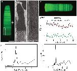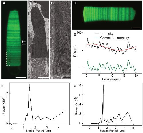 Figure 1. Periodic axial variation in fluorescence intensity in OS expressing a Rho-eGFP transgene. (A) The expression profile of OS (OS) demonstrates a varying level of Rho-eGFP in disk membranes along the OS axis in animals housed in a 24 h (12D:12L) cycle. Periodic axial variation is seen as alternating series of bright fluorescent regions (solid arrows) and dim regions (dotted arrows).(B, C) Electron micrographs of a rod photoreceptor, expressing Rho-eGFP, show equal spacing between disk membranes. Panel C is an enlargement of white box in panel B. The dotted white box in panel A illustrates a similar sized area for comparison. White bar is 5 mm and black bar is 200nm. (D, E) A rod expressing Rho-eGFP was analyzed to determine the intensity difference at peaks and troughs. The green trace represents the periodic variation in fluorescence intensity before (black trace) and after (green trace) subtraction of the aperiodic axial variation fit to a sinusoidal function (red trace). The amplitude of the variation between the maximum and minimum for each period was1.360.07 (mean 6 S.D.) calculated from 90 periods taken from10 cells.(F) Fourier transform analysis of the proximal 20 mm of the OS shown in panel (B) demonstrates a peak at 1.5 mm representing the period of axial variation. The Fourier transform spectra are presented in terms of the spatial periods, and not as the more typical frequencies.(G) Fourier transform analysis of the proximal 20 mm of the OS averaged from five different cells also shows a period at 1.5 mm. doi:10.1371/journal.pone.0080059.g001 |