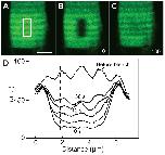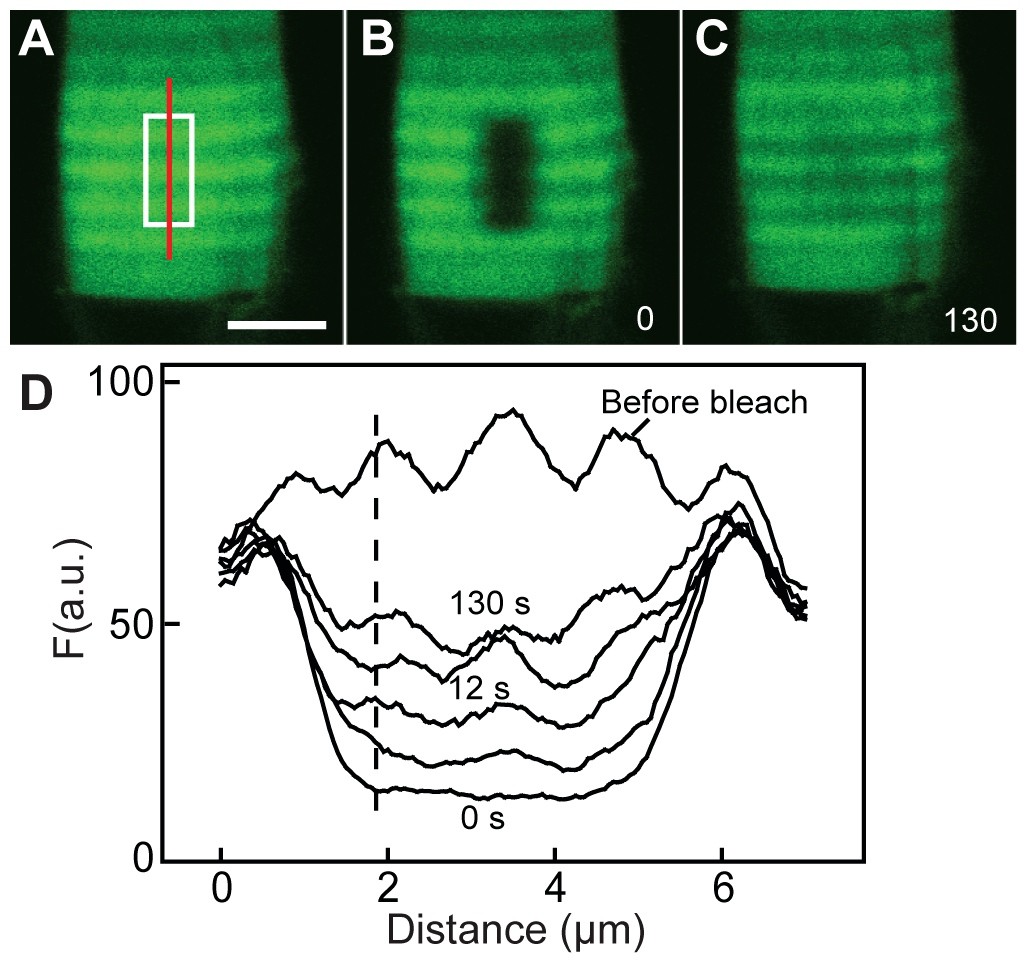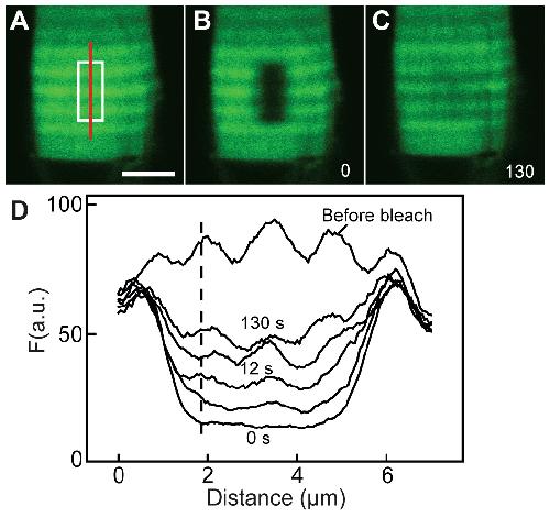 Figure 2. Fluorescence recovery after photobleaching (FRAP) in a live rod expressing Rho-eGFP. (AâC) Sequential fluorescent images from a cell are shown before (A), immediately after photo- bleaching (B) and 130 s later (C). The target area is highlighted in A with a white box.(D) The fluorescence intensity profile scanned through the photobleached area (red line in panel A) demonstrates the recovery of the banding pattern in register with the non-bleached neighboring area. doi:10.1371/journal.pone.0080059.g002 |