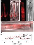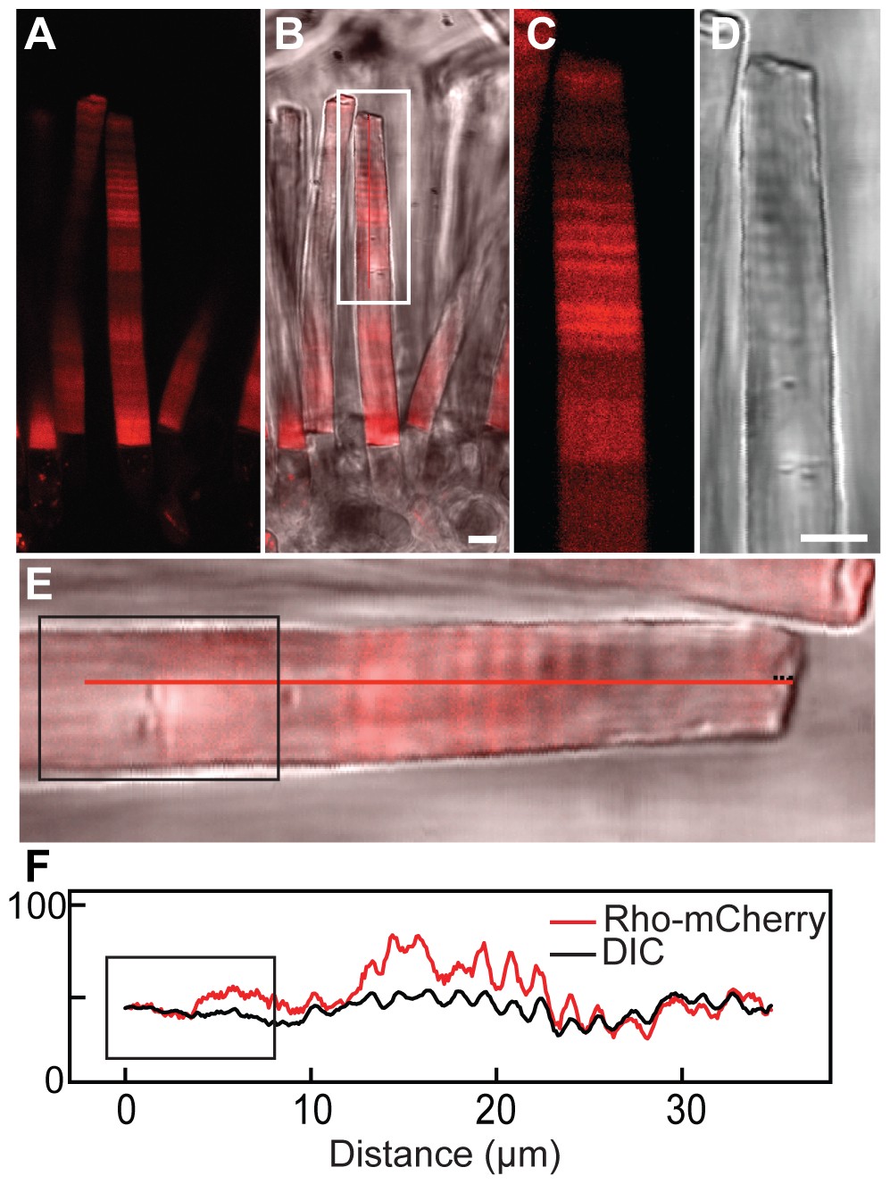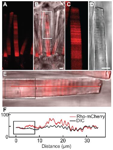 Figure 3. Comparison of periodic axial transgene fluorescence and refractive index variation measured by interferometry.(AâD) The fluorescent and DIC images of a live retinal chip (white box, enlargement of a region of an OS shown in C, D) expressing Rho-mCherry exhibit similar periodic banding in both preparations. (E, F) The intensity profile (F) of the fluorescent and DIC images for rod shown in E demonstrates a synchronized banding pattern. The animal from which the rod shown in E was taken was moved from a 24 h (12D:12L) cycle into constant light (approximate region is boxed in black) for over a week before sacrifice. White bar is 5 µm. |