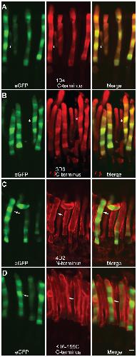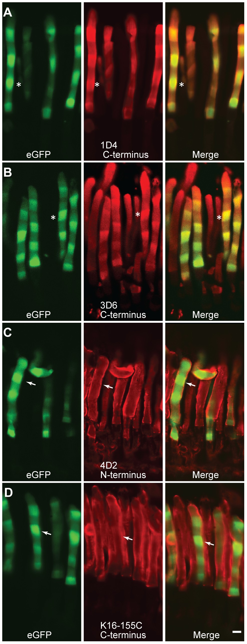 Figure 6. Immunostaining of transgenic retina expressing Rho- eGFP distributed in axial bands with anti-rhodopsin antibod- ies. Adult transgenic frogs expressing Rho-eGFP, which has been modified to contain an epitope for the monoclonal antibody 1D4, were kept for 8 weeks in a 168 h (84Lâ84D) light cycle and then eyes were fixed and immunostained with the indicated antibodies. Rho-eGFP signal (green) is the intrinsic from eGFP fluorescence. The antibodies were detected using a secondary antibody labeled with Cy3 (red). Confocal microscope images of individual and merged channels are presented. Examples of corresponding regions with high Rho-eGFP fluorescence are indicated in A and B by asterisks and in C and D by arrows. White bar is 5 mm. doi:10.1371/journal.pone.0080059.g006 |