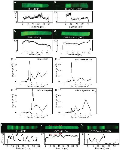 Figure 9. Axial variation of rhodopsin C-terminal mutants and membrane associated eGFP transgenes. Transgenic animals expressing the indicated transgene were housed in either a 24 h (12D:12L, AâD) or 168 h (84L:84D, IâK) light cycle. Representative cells and intensity profilesfrom animals housed in a 24 h (12D:12L) are shown. (EâH) Power spectra of the axial fluorescence intensity distribution from cells expressing the indicated transgenes. To enable comparisons of the power between different cells, the total OS fluorescence intensity for each cell was set to 1 and then the fluorescence intensity distribution was normalized to that value. Note the scales in E and F are different than G and H. RhoDPalm-eGFP has the palmitoylation sites deleted (C322S and C323T), eGFP-dGyrGy contains two geranylgeranyl acceptor sites and eGFP-Syntaxin(TMD) has eGFP fused with the transmembrane domain from syntaxin. doi:10.1371/journal.pone.0080059.g009 |