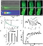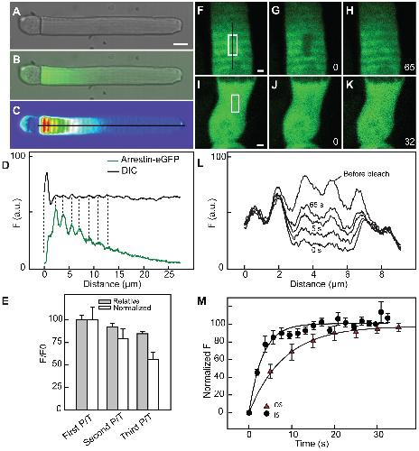 Figure 10. Axial variation of arrestin-eGFP transgenes in the OS. (AâE) A retinal explant from transgenic frogs expressing soluble arrestin- eGFP in rods was dark adapted and then moved to light for an hour before the live imaging. Arrestin-eGFP demonstrated axial variation in fluorescence at the base of the OS with a period of 1â1.4 mm that was synchronized with the DIC variation. The intensity profiles of the cell for both variations are shown (D). The intensity of the fluorescence decreased along the OS and the amplitude of the variation between peak (P) and neighboring trough (T) also decreased. The first peak was ,35% brighter than the next trough (N = 5 cells, p,0.03). Peak/trough ratios (P/T) were calculated for the first three light cycles closest to the base and then normalized to the first peak which was set 100% (Relative) and also after normalization to the mean (Normalized). Error bars represent standard deviation and each of the three bands were statistically different (N = 5 cells, ANOVA p,0.0003). (FâM) Fluorescence recovery after photobleaching. The light adapted rod with arrestin-eGFP in the OS (FâH, L) and IS (IâK) was photobleached within an area near the base of the OS (white box) in panels (F, I) and the fluorescence recovery of the photobleached area was recorded continuously. The intensity profile of this recovery along the black line in panel (F) is shown in panel (L) as a function of time. There is recovery after photobleaching within 65 seconds in the OS, regenerating the axial banding pattern with the same spatial period as neighboring regions. The IS arrestin-eGFP recovered faster that that in the OS. White bars are 1 mm. doi:10.1371/journal.pone.0080059.g010 |