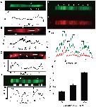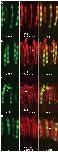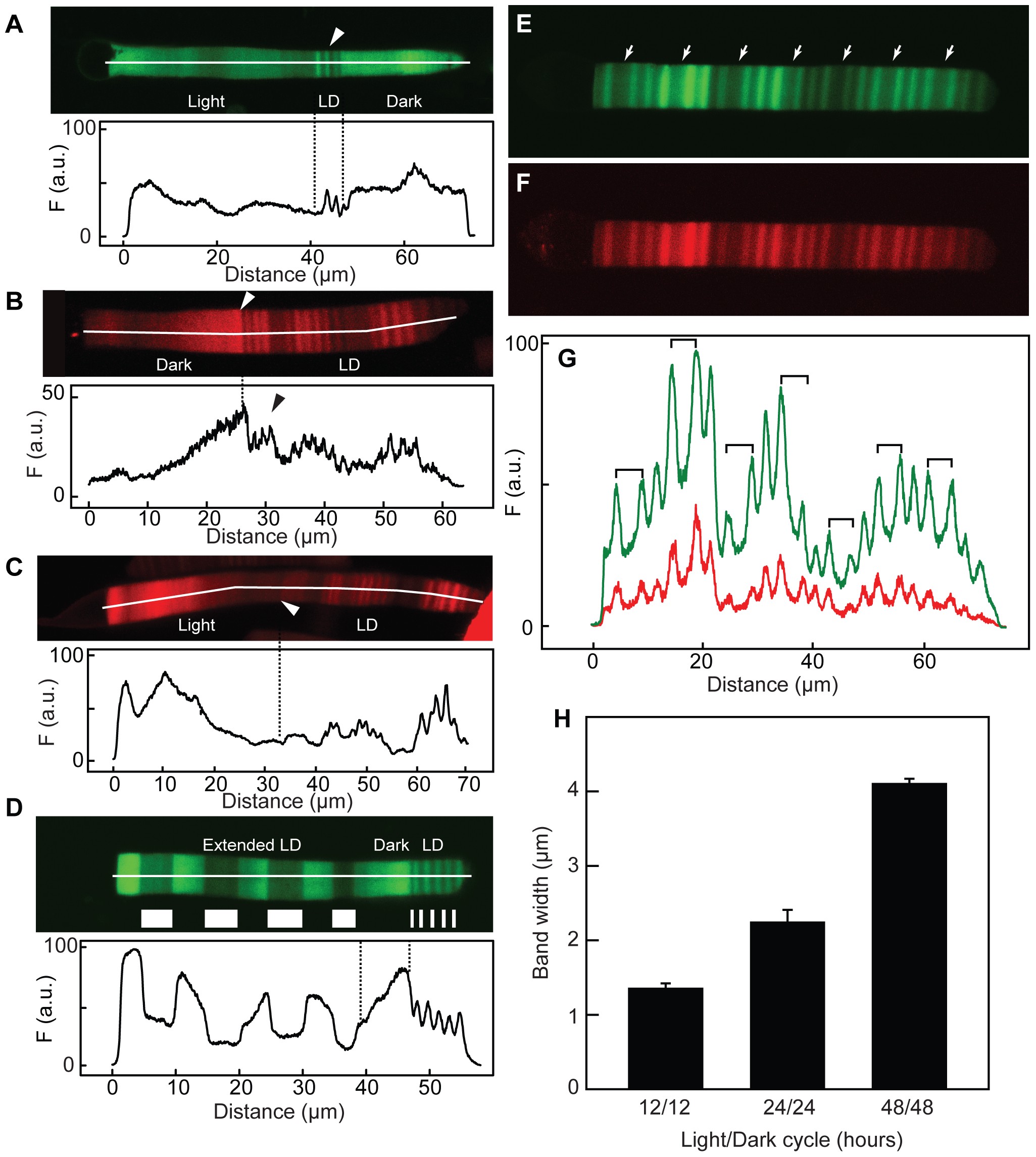 Figure 4. Effect of varying light-dark cycle on periodic axial variation. (A) Transgenic animals expressing Rho-eGFP were housed for 2 weeks in constant darkness, switched to 24 h (12D:12L) for 3 days (LD) and then in constant light for 2 weeks prior to imaging. The intensity profile of the cell is shown below. While axial banding with spatial period 1-1.4 mm are seen in the 24 h light cycle (arrow), little variation with this spatial period was observed in constant dark or light. Note that the rate of membrane addition to the OS is higher in the light than in either cycling or constant dark conditions. (B) Transgenic animals expressing Rho-mCherry were housed in 24 h (12D:12L) light cycle for over 4 weeks (LD) and switched (approximate position indicated by the arrow) to constant darkness for over 2 weeks before imaging. Axial banding with spatial period 1â1.4 mm is seen in the 24 h light cycle (arrow), no variation with this period was observed in constant dark. The intensity profile of the cell is shown below. (C) Transgenic animals expressing Rho-mCherry were housed in 24 h (12D:12L) cycle for over 4 weeks (LD) and switched (approximate position indicated by the arrow) to constant light for over 2 weeks before imaging. Axial banding with spatial period 1â1.4 mm is seen in the 24 h light cycle (LD), no variation with this period was observed in constant dark. The intensity profile of the cell is shown below. (D) Transgenic animals were first housed in a 24 h (12D:12L) cycle for over 4 weeks, switched to constant dark for 7 days and then maintained in a 168 h (84D:84L) cycle until imaging. The animals were sacrificed during the dark period. The approximate regions synthesized in different lighting periods (brighter regions synthesized in the dark) are indicated. A spatial period of 4â6 mm was observed in the extended lighting cycle. The intensity profile of the cell is shown below. (EâG) Transgenic animals expressing Rho-mCherry and Rho-eGFP simultaneously were housed in an asymmetric cycle of 144 h ((24D:24L)4:48L) for 6 weeks. There were two different widths of bands assembled in the light, one with ,2 mm and a wider one (arrows) with ,4 mm. These are associated with the 24 h and 48 h light periods, respectively. (H) Frogs were kept in 24 h (12D:12L) cycle for 4 weeks and then moved to an asymmetric cycle of 96 h (24L:24D:24L:24D:48L). The widths of dark bands (error bars are SD) in cells (N = 3) from these animals were determined. Each light cycle width is statistically different from the others (p,0.5). doi:10.1371/journal.pone.0080059.g004 |