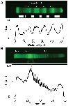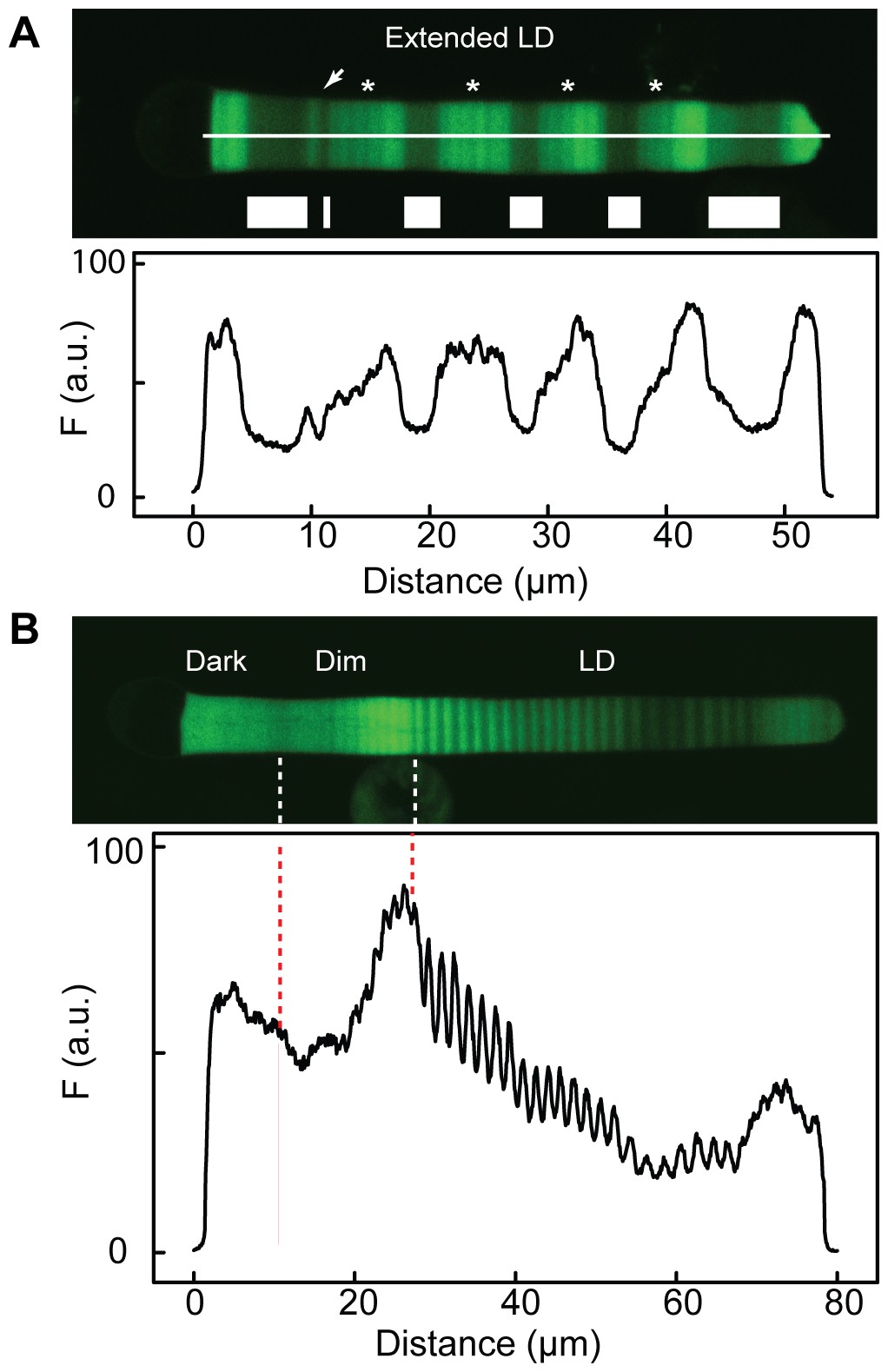 Figure 5. Periodic axial variation in dim light cycles. (A) Transgenic frogs expressing Rho-eGFP were kept for six weeks in 168 h (120D:48L) cycle. During the dark periods, there was dim light exposure since the incubator was not completely light-sealed. In these dark periods (asterisks), there was an increase in fluorescent intensity and an additional axial variation superimposed, with a spatial period of 4â6 mm. At the arrow, the animals experienced one 24 h (12D:12L) cycle and followed by 4 days light and finally a 3-day dark period. Animals were sacrificed during the dark period. The intensity profile of the cell is shown below. (B) Transgenic frogs expressing Rho-eGFP were kept first in a 24 h (12D:12L) cycle (LD) and then moved to an incubator was not completely light-sealed(Dim) for two weeks and were moved to a totally light-sealed chamber (Dark). Cells (N=23) were imaged and a representative cell is shown. The light-sealed chamber did exhibit periodic axial banding as found in the other two regions. The approximate locations of the transitions in lighting are indicated. The intensity profile of the cell is shown below. doi:10.1371/journal.pone.0080059.g005 |