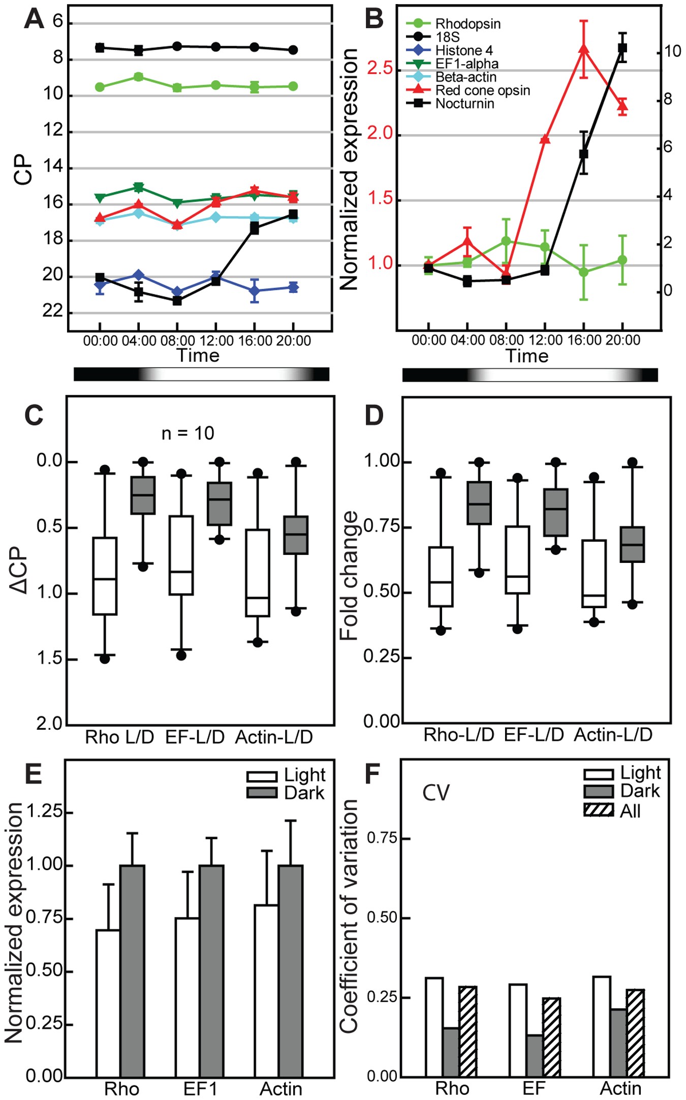 Figure 8. Expression level of rhodopsin transcripts at points in the light cycle. (A) Non-transgenic frogs were kept in 24 h (10D:14L) cycle and sacrificed at 4:00 hr time intervals and RNA extracted from eyes. Real-time PCR was used to quantify transcript levels using (A) PCR crossing point (CP) values. There is a slight increase in the transcript levels of rhodopsin, red cone opsin, and control genes, such as EF1-a and b-actin during the end of dark cycle. Black/white bar shows the dark/light periods (B) CP values normalized to housekeeping genes (see methods for details). The expression levels of rhodopsin and red cone opsin use the left axis scale while nocturnin uses the right Y-axis. The expression levels of rhodopsin, red cone opsin and nocturnin are shown. The expression of red cone opsin increased shortly after light onset, peaked a few hours afterwards and dropped in the dark. The expression of nocturnin increased before dark onset and peaked during the dark period and then returned to baseline. The expression level of rhodopsin, however, did not change significantly. (C, D) The expression levels of rhodopsin transcript and two control genes, EF1-a and b-actin, were determined during both a 24 hr light and 24 h dark cycle. The DCP (C) and fold change (D) in the light (L) and dark (D) values are shown as box plots. There is a higher expression level of all three genes during the dark cycle. The variation of the gene expression is much less during the dark cycle. (E) Expression levels normalized to 18S show ,30% increase in all three genes during the dark cycle. (F) The coefficient of variation in the expression level of genes is shown during the dark or light cycle and combined (All). doi:10.1371/journal.pone.0080059.g008 |