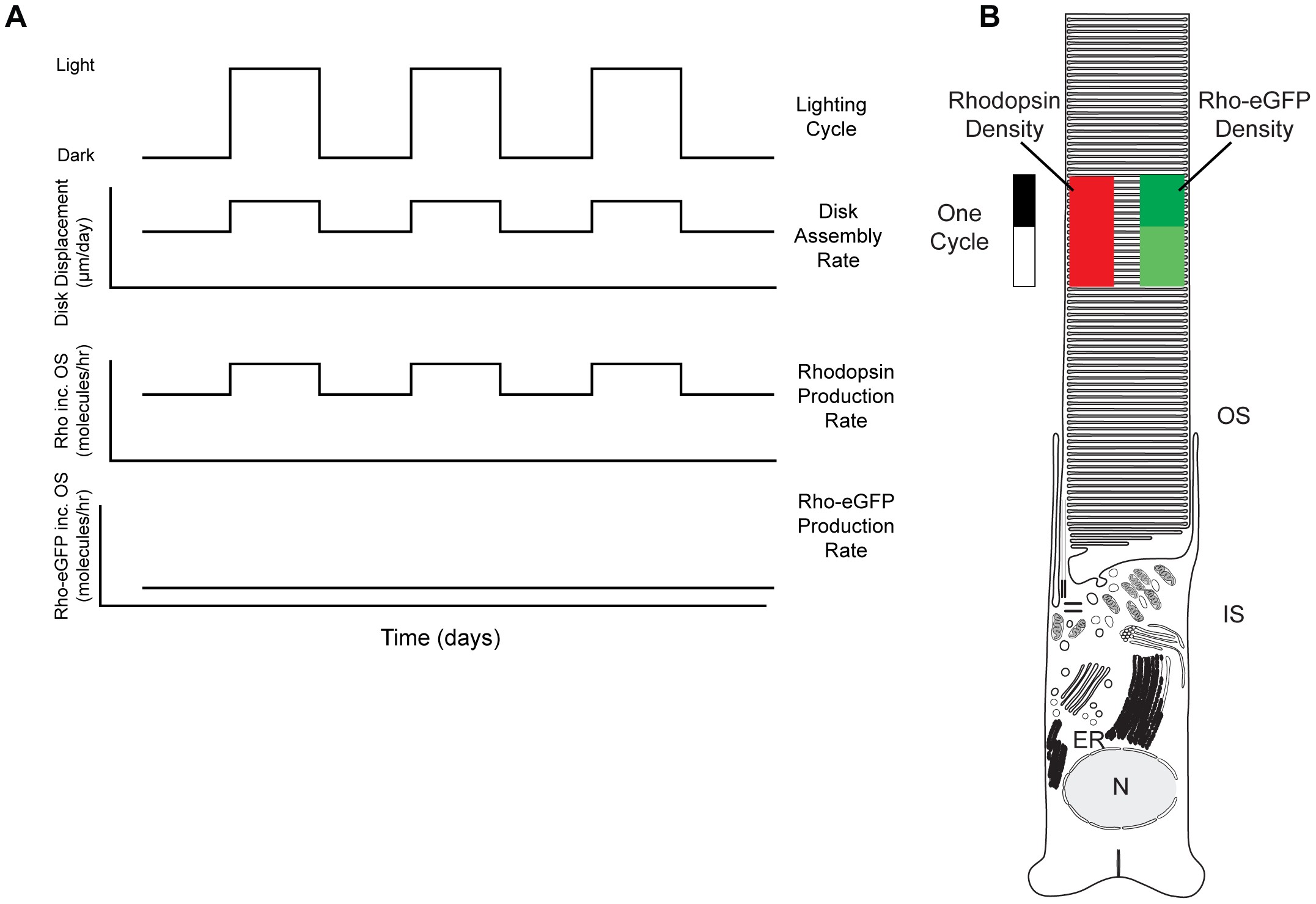 Figure 11. Schematic diagram of light-regulated disk assembly. A. Rods housed in an alternating light-dark cycle (top panel) will vary the rate of disk assembly and displacement (second panel) in response to the phase of the cycle [6,7]. Since endogenous rhodopsin density in OS membranes is constant, the rate of rhodopsin incorporation (third panel) must change in phase with the lighting cycle and disk assembly. By contrast, Rho-eGFP appears to have a relatively constant rate of incorporation into the OS (bottom panel). This would then lead to a periodic variation in Rho-eGFP content, with higher densities assembled at night. B. Schematic diagram illustrating the density variation of Rho-eGFP (green) throughout a light cycle and the absence of variation in endogenous rhodopsin (red). The length of the lighting cycle and the size of the cell are not to scale. doi:10.1371/journal.pone.0080059.g011 |