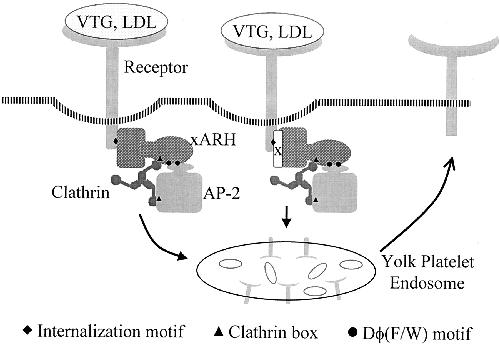 ???displayArticle.abstract??? ARH is required for normal endocytosis of the low density lipoprotein (LDL) receptor in liver and mutations within this gene cause autosomal recessive hypercholesterolemia in humans. xARH is a localized maternal RNA in Xenopus with an unknown function in oogenesis and embryogenesis. Like ARH, xARH contains a highly conserved phosphotyrosine binding domain and a clathrin box. To address the function of xARH, we examined its expression pattern in development and used pull-down experiments to assess interactions between xARH, lipoprotein receptors and proteins in embryo extracts. xARH was detected concentrated at the cell periphery as well as in the perinuclear region of oocytes and embryos. In pull-down experiments, the xARH phosphotyrosine binding domain interacted with the LDL and vitellogenin receptors found in Xenopus oocytes and embryos. Mutations within the receptor internalization signal specifically abolished this interaction. The xARH C-terminal region pulled-down several proteins from embryo extracts including alpha- and beta-adaptins, subunits of the AP-2 endocytic complex. Mutations within either of the two Dvarphi(F/W) motifs found in xARH abolished binding to alpha- and beta-adaptins. Expression of a dominant negative mutant of xARH missing the clathrin box and one functional Dvarphi(F/W) motif severely inhibited endocytosis of vitellogenin in cultured oocytes. The data indicate that xARH acts as an adaptor protein linking LDL and vitellogenin receptors directly with the AP-2 complex. In oocytes, we propose that xARH mediates the uptake of lipoproteins from the blood for storage in endosomes and later use in the embryo. Our findings point to an evolutionarily conserved function for ARH in lipoprotein uptake.