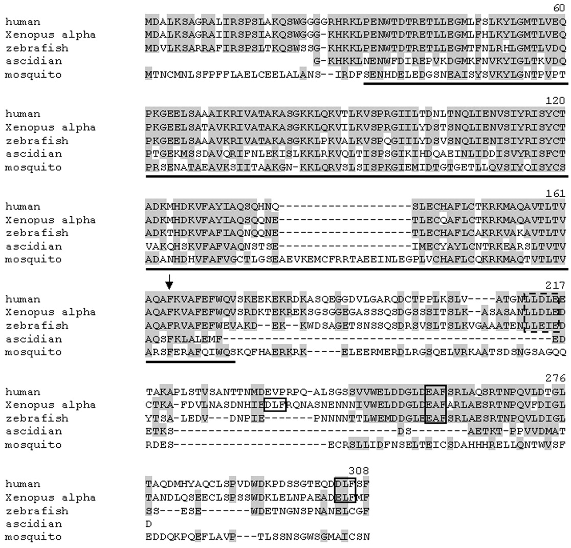 Sequence alignment of ARH homologues from different species. Conserved residues are shaded using the Boxshade program. The PTB domain is underlined, the DφF/W motifs are boxed, and the putative clathrin box is boxed with broken lines. The phenylalanine residue required for the interaction between hARH and LDLR is marked with an arrow. The complete ascidian sequence is not available. The GenBank™ accession numbers for the ARH homologues are as follows: zebrafish, BC045926; ascidian, AV384534; mosquito, AJ281467.
