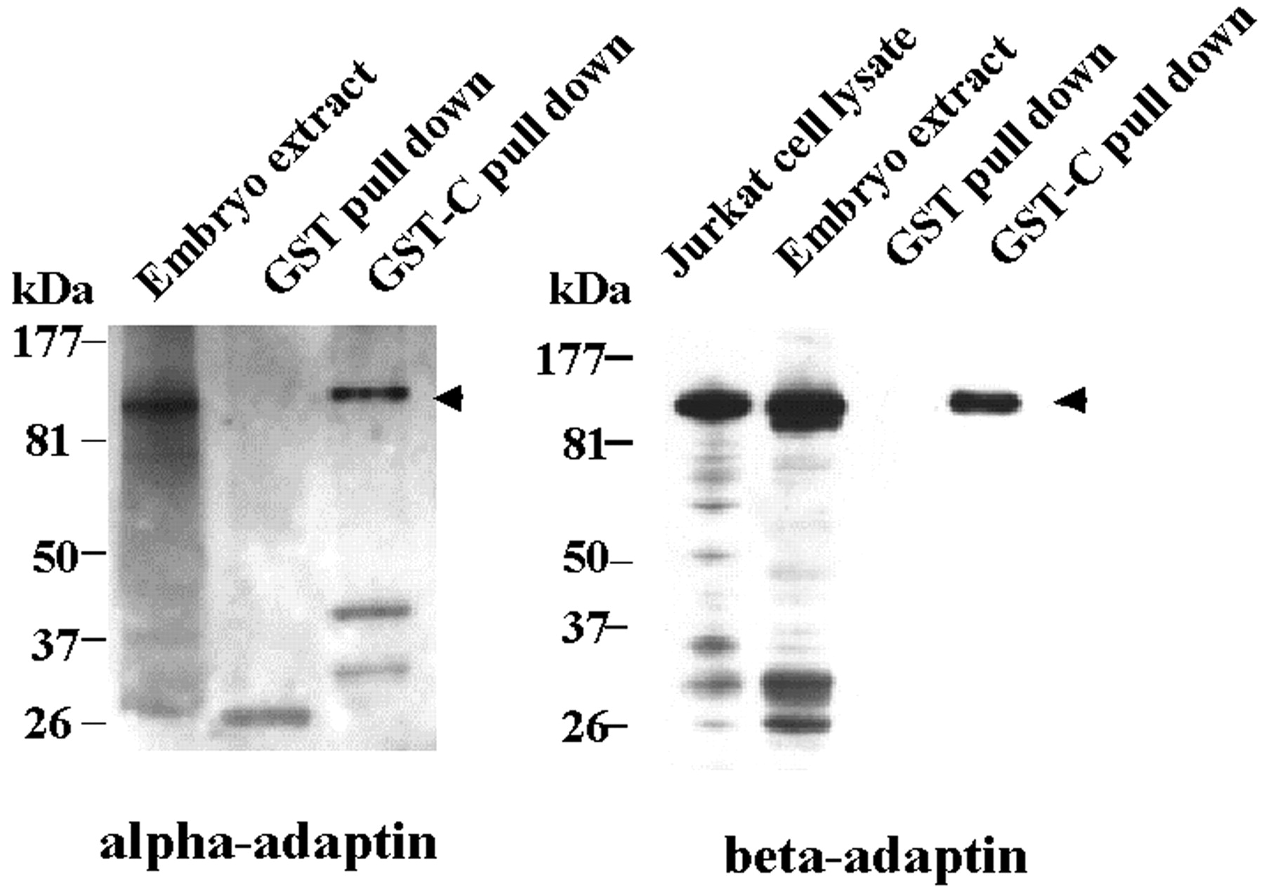 xARH interacts with both α- and β-adaptin. XARH-binding proteins were pulled down with GST-C. Western blot analysis was performed using either monoclonal anti-α or -β adaptin antibody (Affinity BioReagents, Inc. and BD Bioscience). Both α- and β-adaptin (arrowheads) can be pulled down by GST-C but not by GST alone. The lower molecular weight mass are most likely β-adaptin degradation products.