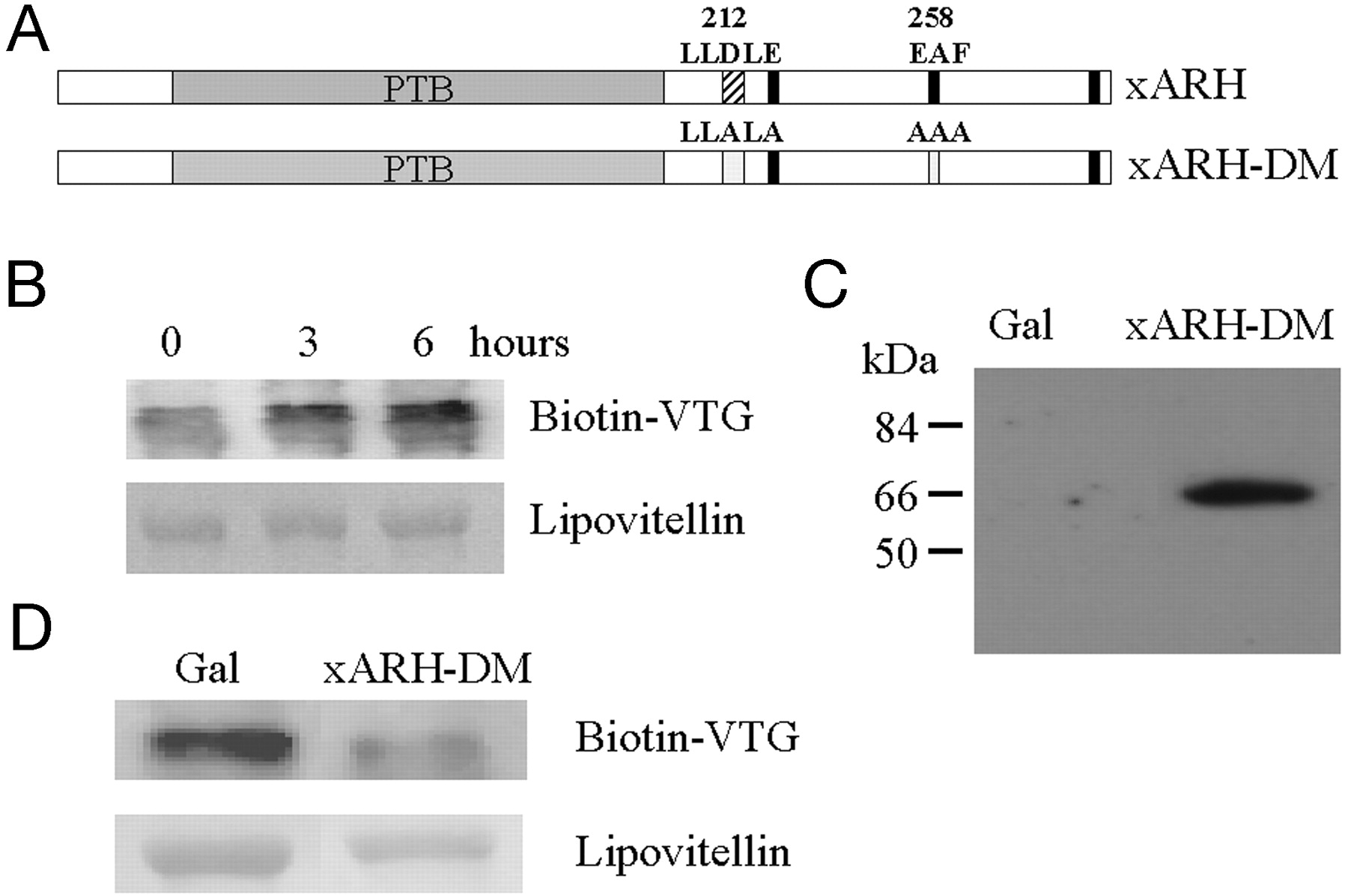 Expression of xARH dominant negative mutant (xARH-DM) in cultured oocytes inhibited vitellogenin endocytosis. A, schematic diagram of xARH-DM showing mutations in the clathrin box (LLDLE) and the 258 DÏ(F/W) motif. B, stage III oocytes were incubated in culture medium containing biotinylated VTG for various periods of time. Surface-bound VTG was removed by washing with a high pH buffer. The internalized biotinylated VTG was detected using streptavidin-HRP conjugate. The nitrocellulose membrane was stained with Ponceau S to visualize the lipovitellin band used as a loading control. Biotin-VTG was progressively internalized over the culture period. C and D, after the injection of 5 ng of xARH-DM or control galactosidase (Gal) transcripts, oocytes were cultured overnight. The expression of Myc-tagged xARH-DM protein was confirmed by Western blot analysis (C), and VTG uptake was measured (D) as described in B. xARH-DM severely inhibited VTG uptake compared with the galactosidase control.