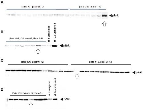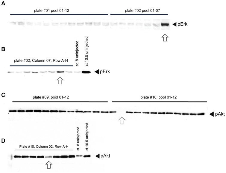 Figure 5. Examples on identification and de-convolution of active regulators.(AâB) identification of the MAPK/Erk activator fbxo43 (erp1). (A) Western blot of stage 8 embryos injected with 12 pools (01â12) derived from plate #01 and 7 pools (01â07) from plate #02 and probed with anti-phospho-Erk (pErk) antibody. The arrow indicates increased Erk phosphorylation upon injection of mRNAs derived from plate #02, pool 07. (B) De-convolution of the above pool. Embryos injected with single RNAs were collected at stage 8 and uninjected lysate from stage 8 and stage 10.5 were used as negative and positive control of Erk phosphorylation respectively. The arrow indicates the active clone of TEgg009F05, identified in plate #2, column 08, row G. This clone was confirmed as the X. tropicalis fbxo43 (erp1) gene. (CâD) Identification of PI3K/Akt inhibitor prkaca. (C) Western blot of stage 10.5 embryos injected with 24 pools (01â12) derived from plate #09 and #10 and probed with anti-phospho-Akt (pAkt) antibody. The arrow indicates decreased Akt phosphorylation upon injection of mRNAs derived from plate #10, pool 02. (D) De-convolution of the above pool. mRNA synthesis, injection, and Western blot were performed as in (B) except that stage 10.5 embryos were used. The arrow indicates the active clone of TEgg046d13 is identified in plate #09, column 02, row E. This clone was later identified as encoding the X. tropicalis prkaca gene. |
