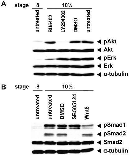 Figure 1. Characterisation of phospho-specific antibodies.(A) Characterisation of anti-phospho-Akt (pAkt) and anti-phospho-Erk (pErk) antibodies, the PI3K/Akt inhibitor LY294002 and FGF inhibitor SU5402 were used to inhibit Akt and Erk phosphorylation in gastrula embryos, respectively. 1% DMSO was used to exclude any possible interference from the inhibitor solvent. Anti-Erk (Erk), anti-Akt (Akt) and anti-α-tubulin (α-tubulin) were used as loading controls. (B) Characterisation of anti-phospho-Smad1/5/8 (pSmad1) and anti-phospho-Smad2 (pSmad2) antibodies. The TGF-βRI inhibitor SB505124 was used to inhibit Smad2 phosphorylation in gastrula embryos; injection of wnt8a mRNA was used to inhibit bmp4 expression, thus preventing Smad1/5/8 phosphorylation. All inhibitors have been added at stage 6. 1% DMSO was used to exclude any possible interference from the inhibitor solvent. Smad2 and α-tubulin serves as internal controls to ensure equal loading in all lanes. |