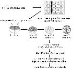 Figure 3. Flowchart of the experimental procedure of the screen.A X. tropicalis library of unique, full-length clones has been established based on sequence comparison and clustering of over 1,220,000 ESTs, and rearrayed in a 96-well plate format. Pools of 8 mRNAs were prepared from pooled bacteria culture and in vitro transcription. Then in vitro transcribed mRNA pools were injected into fertilized X. laevis embryos at 1â2 cell stage. After microinjection, injected embryos were collected at stage 8 (blastula), stage 10.5 (gastrula), and stage 14 (neurula). Protein extracts from embryos were loaded onto SDS-PAGE for subsequent Western blot analysis. Antibodies used include anti-phospho-Smad1/5/8, anti-phospho-Smad2, anti-phospho-Akt, and anti-phospho-Erk. Once a potential active pool was identified, the pool was de-convoluted and single molecule injection was performed to identify the active molecule. |