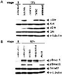 Figure 2. Kinetics of the activation of signalling molecules during early Xenopus development.X. laevis embryos were collected at the time indicated and subjected to Western blot analysis. Membranes were probed with anti-phospho-Smad1/5/8 (pSmad1) antibody for monitoring BMP activity, anti-phospho-Smad2 (pSmad2) antibody for TGF-β/Nodal signalling, anti-phospho-Erk (pErk) for MAPK/Erk signalling and anti-phospho-Akt (pAkt) for PI3K/Akt signalling. Anti- Smad2, anti- Akt, and anti-Erk were used as loading controls to ensure all lanes have been loaded equally. |