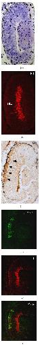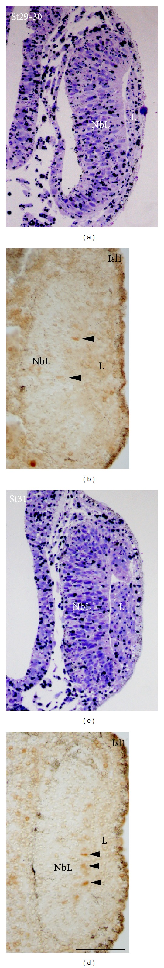 Figure 3. Morphological features and expression patterns of Isl1 in the St29/30 ((a), (b)) and St31 ((c), that Isl1 is also expressed by undi (d)) Xenopus laevis retina. ((a), (c)) Toluidine blue-stained transverse retinal resin sections showed that the neural retina had the structure of pseudostratified columnar epithelium. Notice that during these early stages abundant dark-stained granules were observed in the cytoplasm of the neuroepithelial cells. (b),(d) Isl1 immunoreactivity was present in sparse nuclei mainly located near the vitreal surface (arrowheads). L: lens; NbL: neuroblastic layer. Scale bar: 50 μm. |