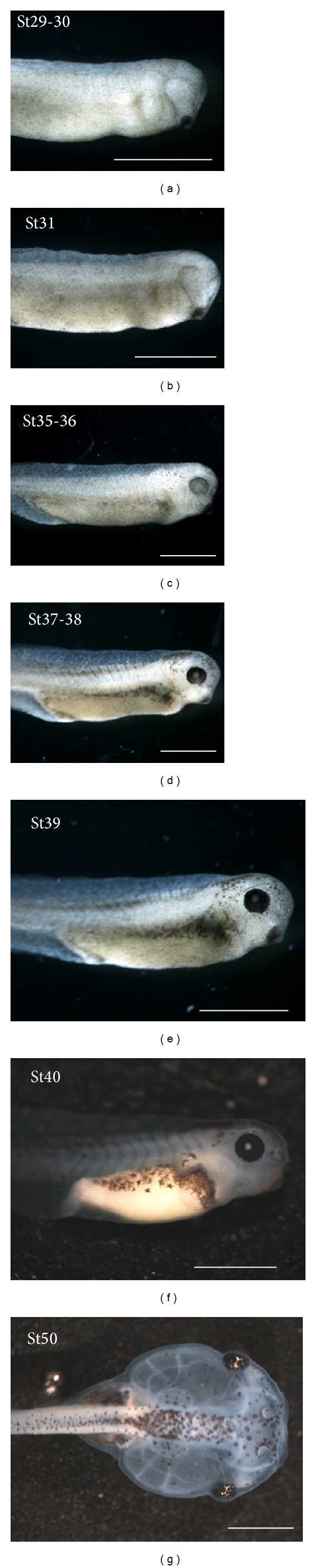 Figure 1. Stereomicroscope images of selected lateral views of Xenopus laevis tailbud embryos ((a)â(f)) and a dorsal view of a free-swimming tadpole (g) according to developmental stages (St) of Nieuwkoop and Faber [37]. Scale bars: 1âmm. |