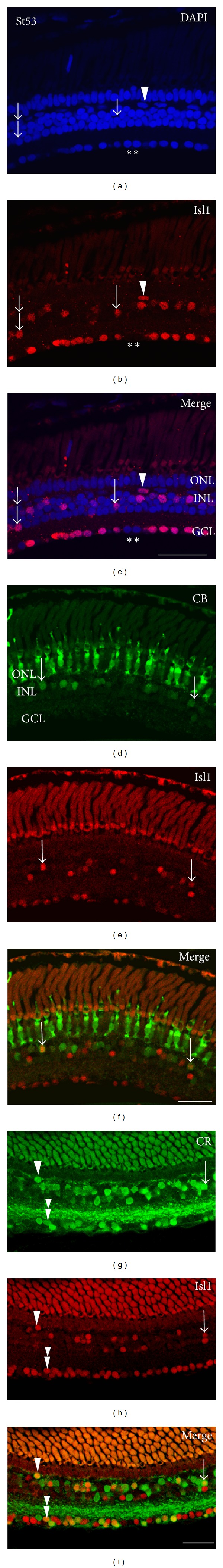 Figure 2. Morphological features and expression patterns of Isl1 and other cell differentiation markers in the St53 Xenopus laevis central retina. (a)–(c) DAPI fluorescence combined with Isl1 immunofluorescence. DAPI staining showed well-organized retinal layers. Isl1 expressing cells in the INL could be characterized morphologically and topographically as horizontal (arrowheads), bipolar (arrows), or amacrine cells (double arrows). Notice that not all cells located in the GCL expressed Isl1 (asterisks). (d)–(f) A few Isl1-positive bipolar cells also expressed CB (arrows). (g)–(i) Subpopulations of Isl1-positive horizontal (arrowheads), bipolar (arrows), and ganglion cells (double arrowheads) also expressed CR. GCL: ganglion cell layer; INL: inner nuclear layer; ONL: outer nuclear layer. Scale bars: 100 μm. |