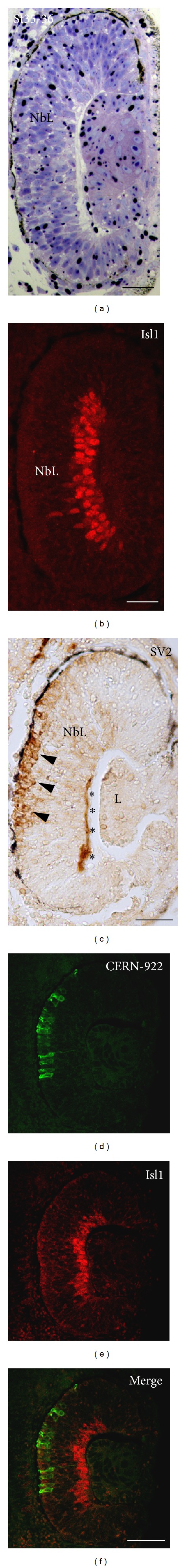 Figure 4. Morphological features and expression patterns of Isl1 and other cell differentiation markers in the St35/36 Xenopus laevis retina. (a) Toluidine blue-stained transverse retinal resin sections showed that neural retina remained undifferentiated during this stage. (b) Although no plexiform layers were observed, many Isl1-positive nuclei were mainly located near the inner surface of the neuroretina. (c) Immunoreactive ganglion cell axons for SV2 were observed in the vitreal surface of the retina (asterisks). Furthermore, immunoreactivity was also detected near the scleral surface of the undifferentiated retina (arrowheads). (d)–(f) CERN-922 antibody revealed that sparse photoreceptors were differentiating by this stage in the scleral surface of the central nonlayered retina ((d), (F)). L: lens; NbL: neuroblastic layer. Scale bars: 50 μm. |