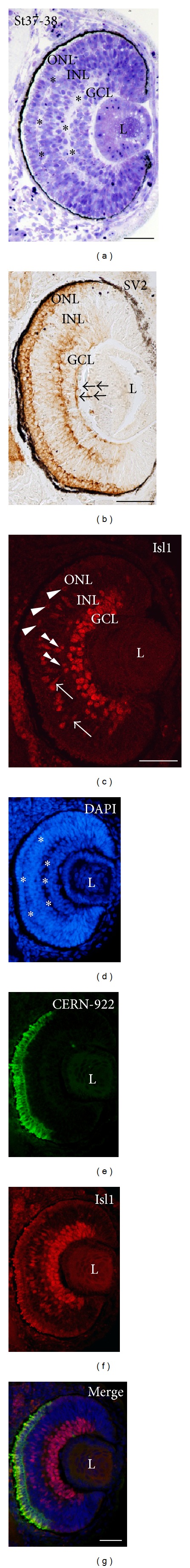 Figure 5. Morphological features and expression patterns of Isl1 and other cell differentiation markers in the St37/38 Xenopus laevis retina. (a) Toluidine blue-stained transverse retinal resin sections showed that the plexiform layers were observed across the central to mid-peripheral extent of the retina (asterisks). An immature GCL, 2-3 cells in depth, was also observed at this stage. (b) SV2 immunoproducts were observed in the OFL (double arrows), IPL, and ONL. (c) Abundant nuclei were immunoreactive for Isl1 in the GCL, but also in the INL. Thus, nuclei located in the amacrine cell layer (double arrowheads), bipolar cell layer (arrows), and horizontal cell layer (arrowheads) were detected with this antibody. (d)–(g) Incipient plexiform layers were also clearly distinguishable with the DAPI nucleic acid stain (asterisks in (d)). CERN-922 immunoreactivity paralleled the expression of Isl1 and extended towards the more mid-peripheral region of the retina. GCL: ganglion cell layer; INL: inner nuclear layer; L: lens; ONL: outer nuclear layer. Scale bars: 50 μm. |
