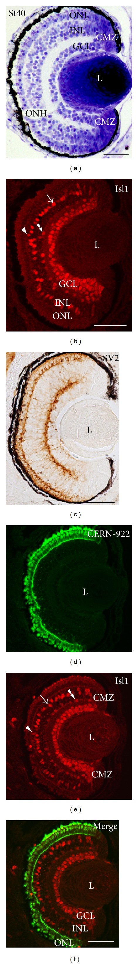 Figure 6. Morphological features and expression patterns of Isl1 and other cell differentiation markers in the St40 Xenopus laevis retina. (a) Toluidine blue-stained transverse retinal resin sections revealed that the typical multilayered structure was clearly distinguishable, showing morphological features of maturation. The CMZ was visible in the peripheralmost region. (b) Isl1 immunoreactivity was clearly established in abundant nuclei located in the GCL, whereas the INL contained Isl1 labeling that corresponded to horizontal (arrowhead), bipolar (arrow), and amacrine cells (double arrowhead). (c) SV2 expression in the plexiform layers extended to more peripheral regions. (d)–(f) The CERN-922 labeling in the ONL coursed in parallel with Isl1 immunoreactivity and reached the periphery by this stage. CMZ: ciliary marginal zone; GCL: ganglion cell layer; INL: inner nuclear layer; L: lens; ONH: optic nerve head; ONL: outer nuclear layer. Scale bars: 100 μm. |