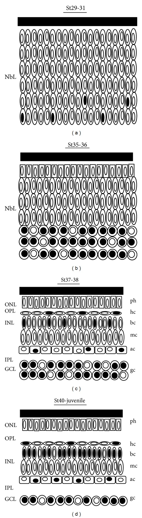 Figure 7. Schematic drawings of the Isl1 positive cells in the developing retina of Xenopus laevis. Black nuclei represent Isl1-immunostained cells. (a) Isl1 immunoreactivity during St29–31 was restricted to nuclei located near the vitreal surface of the NbL. (b) Although the retinal lamination was absent in the St35-36, cell differentiation was detected immunohistochemically. Abundant Isl1-positive cells were located in the vitreal half of the NbL. (c) At St37-38, retinal layering was completed in the central retina with the emergence of the plexiform layers. Isl1 immunoreactivity was detected in the GCL and in cell subpopulations located in the INL. (d) From St40 onwards Isl1 immunoreactivity was confined to subpopulations of ganglion, amacrine, bipolar, and horizontal cells. Ac: amacrine cell; bc: bipolar cell; gc: ganglion cell; GCL: ganglion cell layer; hc: horizontal cell; INL: inner nuclear layer; IPL: inner plexiform layer; L: lens; mc: Müller cell; NbL: neuroblastic layer; ONL: outer nuclear layer; OPL: outer plexiform layer; ph: photoreceptor. |