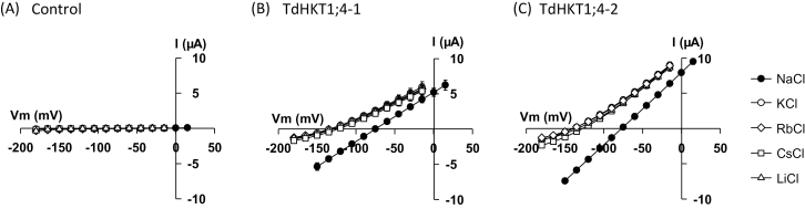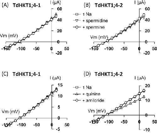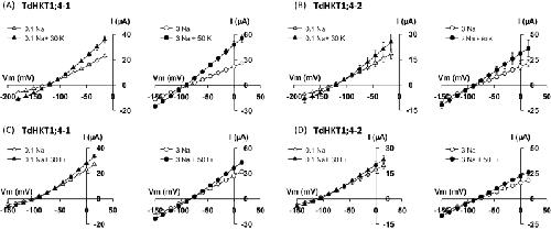 Functional characterization in Xenopus oocytes of Na+ transport systems from durum wheat reveals diversity among two HKT1;4 transporters.