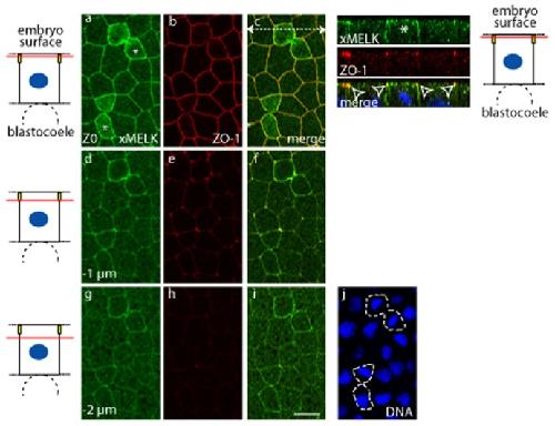Fig. 3. In epithelial cells xMELK accumulates at the tight junctions.Confocal microscopy of indirect immunofluorescence with anti-xMELK (green) and anti-ZO-1 (red) antibodies of epithelial cells from fixed albino embryos at gastrula stage. Three single optical sections spaced by 1 µm are shown. Asterisks indicate cytokinetic cells. Diagrams on the left: red lines mark the confocal planes relative to embryo surface and yellow rectangles symbolize tight junctions. Images were merged to visualize co-localization of xMELK with ZO-1 (merge, c,f,i). DNA is blue (j), dividing cells are indicated by dashed lines. White dashed arrow in panel c symbolizes the plane used for orthogonal projection of confocal planes shown on the right. Arrowheads point to the xMELK which co-localizes with ZO-1 at the tight junctions. Scale bar: 20 µm.