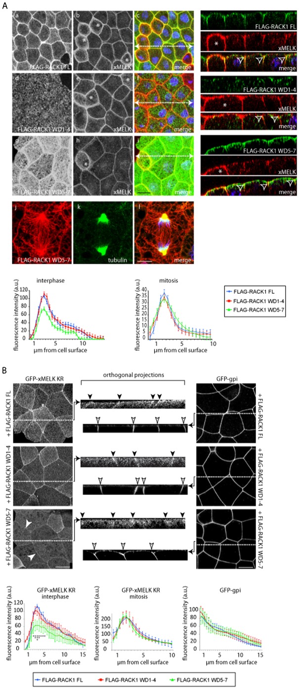 Fig. 8. RACK1 regulates localization of iMELK.(A) Gastrula embryos expressing FLAG-RACK1 FL, FLAG-RACK1 WD1–4 and FLAG-RACK1 WD5–7 were fixed and processed for indirect immunofluorescence with anti-FLAG (a,d,g) and anti-xMELK antibodies (b,e,h). Pictures were merged (merge, c,f,i) together with pictures of DNA (blue) at the same confocal planes to visualize co-localization of xMELK (red) with FLAG-RACK1 constructs (green). Embryos expressing FLAG-RACK1 WD5–7 were incubated with a rabbit polyclonal anti-FLAG (j) and a mouse monoclonal anti-tubulin (k) antibody. Pictures were merged together with pictures of DNA (blue) to visualize FLAG-RACK1 WD5–7 and microtubules. White dashed arrows in panels c, f and i indicate the plane used for orthogonal projections of confocal planes shown on the right. Asterisks indicate cytokinetic cells. Arrowheads point on xMELK concentrated at the tight junctions. Scale bars: 20 µm (a–i), 10 µm (j–l). Intensity of the xMELK fluorescent signals at the cell–cell contacts in embryos expressing FLAG-RACK1 FL, FLAG-RACK1 WD1–4 and FLAG-RACK1 WD5–7 were quantified in interphase and mitotic cells for each 0.5 µm confocal plane. (B) Embryos were coinjected with FLAG-RACK1 FL, FLAG-RACK1 WD1–4 and FLAG-RACK1 WD5–7 mRNAs with GFP-xMELK KR or GFP-gpi mRNAs. White dashed lines mark the plane used for orthogonal projections of confocal planes shown in the center. Arrows points to the apical junctional complex. Black and white arrows points to GFP-xMELK and GFP-gpi, respectively. Scale bars: 20 µm. The intensity of the GFP-xMELK KR and GFP-gpi fluorescent signals at the cell–cell contacts in embryos expressing FLAG-RACK1 FL, FLAG-RACK1 WD1–4 and FLAG-RACK1 WD5–7 was quantified in interphase and mitotic cells for each 0.5 µm confocal plane. Statistical analysis was performed. *GFP-xMELK KR+ FLAG-RACK1 WD5–7 is significantly different from GFP-xMELK KR+ FLAG-RACK1 FL at p<0.005, **p<0.002, ***p<0.0003. Note that asterisks are oriented vertically on the figure. For other points 0.5>p>0.005.