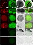 Fig. 4. xMELK localization in interphase and dividing cells of dissociated blastula embryos.Pigmented embryos were dissociated by incubation in calcium and magnesium devoid medium. Isolated cells were fixed and immunofluorescence was performed with anti-xMELK (red, a,e,i,m) and anti-C-cadherin (green, b,f,j,n) antibodies. Control cells (q–x) were processed for indirect immunofluorescence like others except that the primary antibody was omitted. Bright field microscopy (BF, grey, c,g,k,o,s,w) shows pigmented epithelial cells (a–h,q–t) and mesenchyme-like cells devoid of pigments (i–p,u–x). Images were obtained by projection of 10 single confocal sections. Images were merged to visualize co-localization of xMELK with C-cadherin (merge, d,h,l,p,t,x). Interphase (a–d,i–l,q–x) and dividing (e–h,m–p) cells are shown. Scale bar: 100 µm.