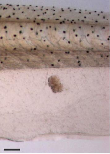 Fig. S4. Cell cluster formation after cell injection into the fin. Example of an injection of cells into the fin showing the formation of a cell cluster at the injection site. Injected cells remain clearly visible under the microscope for up to 1 week. Only tadpoles with comparable cell cluster size were used in the experimental analysis. Scale bar: 200 mm.