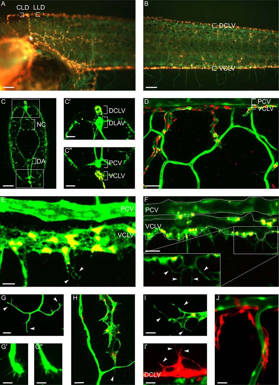 (A,B) Specific �LEC labeling� of lymph vessels (orange) by TRITC-dextran 24 hours after angiography of stage 46 tadpoles, allowing prolonged visualization of the vessels in the lymph heart (asterisk) area (A) and tail (B). (C�C″) Confocal imaging of cross sections of a LEC labeled tadpole confirmed exclusive labeling of lymphatics (DCLV, VCLV), while blood vessels (PCV, DA) remain green. C′�C″ are higher magnifications of the dorsal (C′) and ventral (C″) frames in panel C. (D) High magnification of vascular sprouting into the fin showed distinct morphology between smooth blood vessels (green) and the spiky lymphatics (red/orange). (E,F) Blood vessel (PCV, green) and lymph vessel (VCLV, yellow/organge) in close proximity. LECs of the VCLV exhibit small protrusions and filopodia (arrowheads). (G�G″) Newly forming blood vessel sprouts display a typical tip cell phenotype (arrowheads) with several filopodia. G′�G″ are higher magnifications of angiogenic tip cells. (H) Lymphatic tip cell with protruding filopodia (arrowhead). (I,I′) High magnification of lymphatic tip cells with filopodia (arrowheads) at the forefront of a lymph vessel in the fin (I) or of a new sprout forming from the DCLV (I′). (J) Lymphatics (red) occasionally sprouted at the same site as blood vessels (green), seemingly using them as a scaffold for further elongation into the fin. CLD, cephalic lymph duct; DA, dorsal aorta; DCLV, dorsal caudal lymph vessel; LLD, lateral lymph duct; NC, notochord; PCV, posterior cardinal vein; VCLV, ventral caudal lymph vessel. Scale bars: 200 �m (A,B), 100 �m (C), 50 �m (C′,C″,D,G), 20 �m (E,F,H,I′,J), 10 �m (G′,G″,I).