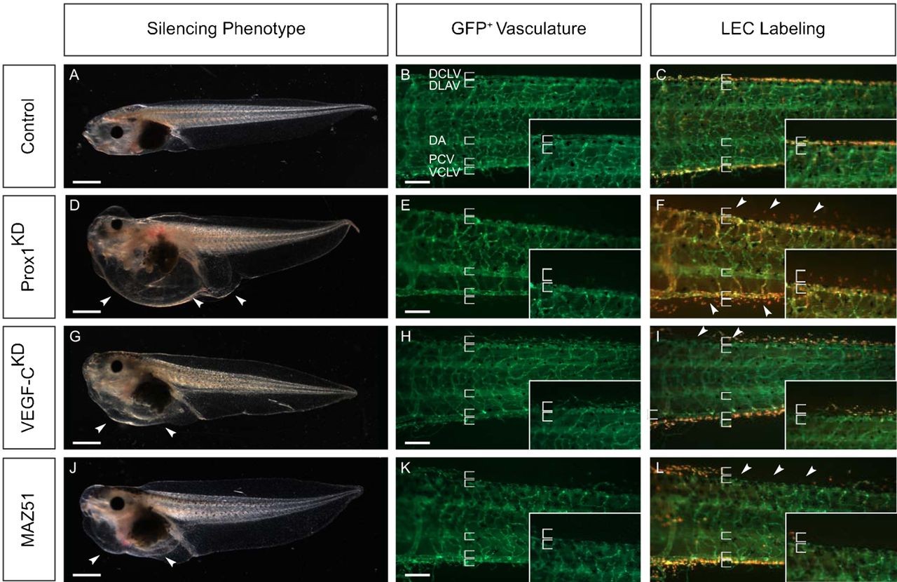 All panels depict lateral views of stage 45 tadpoles, head facing left. All insets show higher magnification of the dorsal side, with top and lower bracket denoting DCLV and DLAV, respectively. (A�C) Control embryo showing normal morphology (A) and correctly formed GFP+ (B) and LEC labeled lymphatics (C). (D�F) Morpholino knockdown (KD) of xProx1 resulted in edema around heart, gut and cloaca (arrowheads in panel D). GFP fluorescent microscopy showing that Prox1KD tadpoles possess few and disorganized LECs failing to assemble into the dorsal and ventral lymphatics (E). LEC labeling showing fewer LECs in xProx1KD tadpoles. Arrowheads denote sites where longitudinal lymph vessels are missing or malformed (green: DLAV, orange: DCLV) (F). (G�I) Morpholino knockdown (KD) of xVEGF-C resulted in edema in the heart and gut (arrowheads in panel G). Reporter VEGF-CKD tadpoles revealing a fragmented DCLV consisting of dispersed and scattered LECs on the dorsal side while the VCLV appears grossly normal as shown by fluorescent microscopy (H) and LEC labeling (I). Arrowheads denote sites where longitudinal lymph vessel is missing. (J�L) Chemical inhibition of VEGFR-3 by MAZ51 treatment (10 �M) resulted in edema in the heart and gut (arrowheads in panel J). Fluorescent microscopy (K) and LEC labeling (L) revealing a disorganized and fragmented DCLV consisting of few LECs, while the VCLV appeared normal. Arrowheads denote where longitudinal lymph vessels are missing. DA, dorsal aorta; DCLV, dorsal caudal lymph vessel; DLAV, dorsal longitudinal anastomosing vessel; PCV, posterior cardinal vein; VCLV, ventral caudal lymph vessel. Scale bars: 1 mm (A,D,G,J), 250 �m (B,E,H,K).