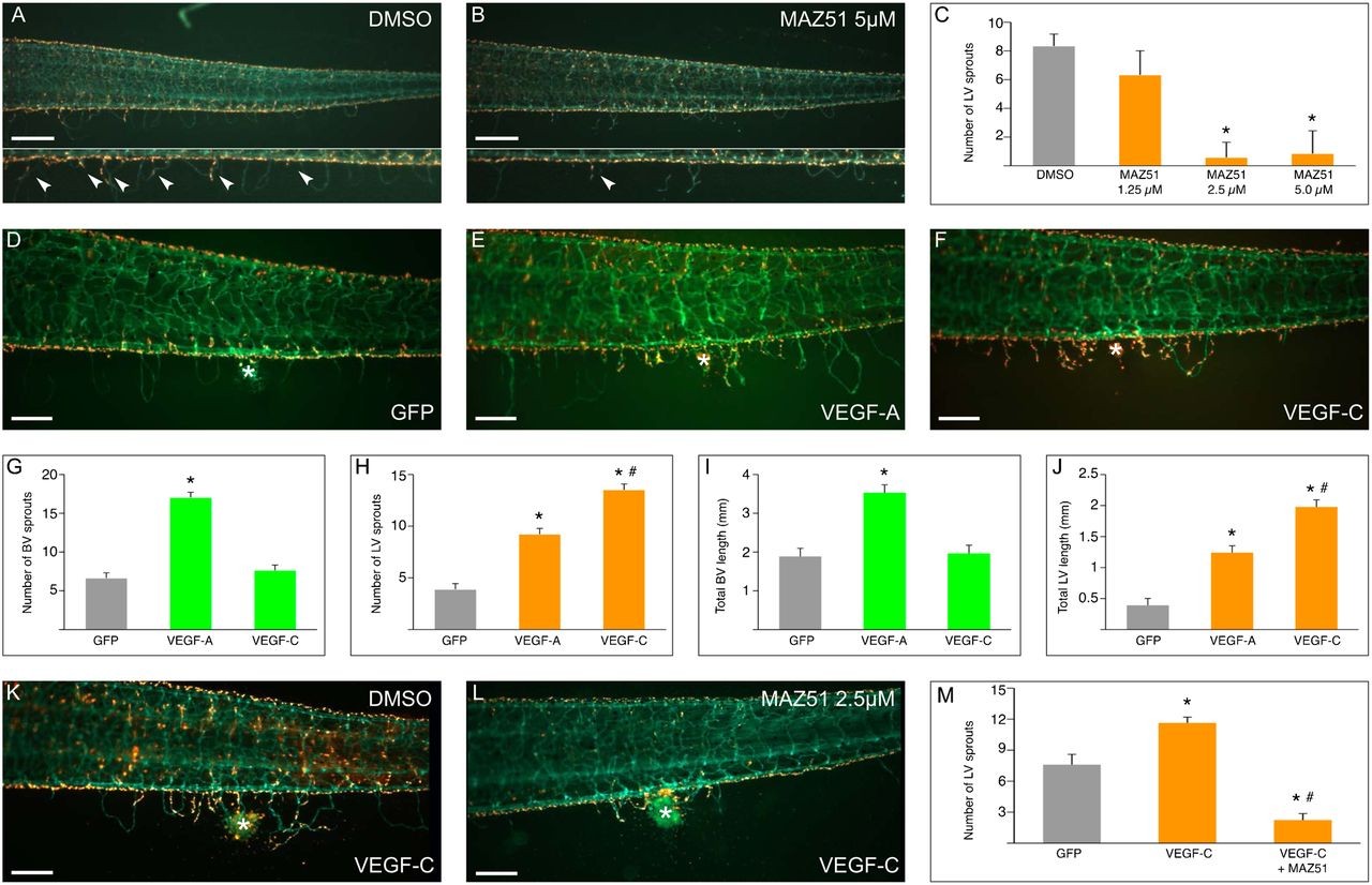 All photos depict lateral views of LEC labeled stage 49 Tg(Flk1:eGFP) tadpoles (blood vessels green, lymph vessels orange), head facing left. (A�C) Representative micrographs showing inhibition of lymphatic sprouting into the fin (arrowheads) upon MAZ51 treatment (5 �M) (B), as compared to DMSO treated controls (A). Quantification of lymphatic sprout numbers in panel C (*P<0.001 compared to DMSO control). (D�J) Representative micrographs of effect of GFP (control) (D), VEGF-A (E) and VEGF-C (F) overexpression on blood and lymph vessel sprouting after injection of transfected cells in the fin. Asterisk denotes the location of the cell cluster. Quantification of the number of blood vessel sprouts (G), lymph vessel sprouts (H), total blood vessel length (I) and total lymph vessel length (J) (*P<0.001 compared to GFP control, #P<0.001 compared to VEGF-A overexpression). (K�M) Chemical inhibition of VEGF-C induced lymphatic sprouting by MAZ51. Representative micrographs of tadpoles injected with VEGF-C overexpressing cells and treated with DMSO (K) or MAZ51 (L). Corresponding control with GFP overexpressing cells (quantified in panel M) is not shown. Asterisk denotes the location of the cell cluster. Quantification of the number of lymphatic sprouts after MAZ51 treatment in panel M (*P<0.001 compared to GFP control, #P<0.001 compared to VEGF-C overexpression). Scale bars: 500 �m (A,B), 250 �m (D�F,K,L). Quantitative data are mean � s.e.m.