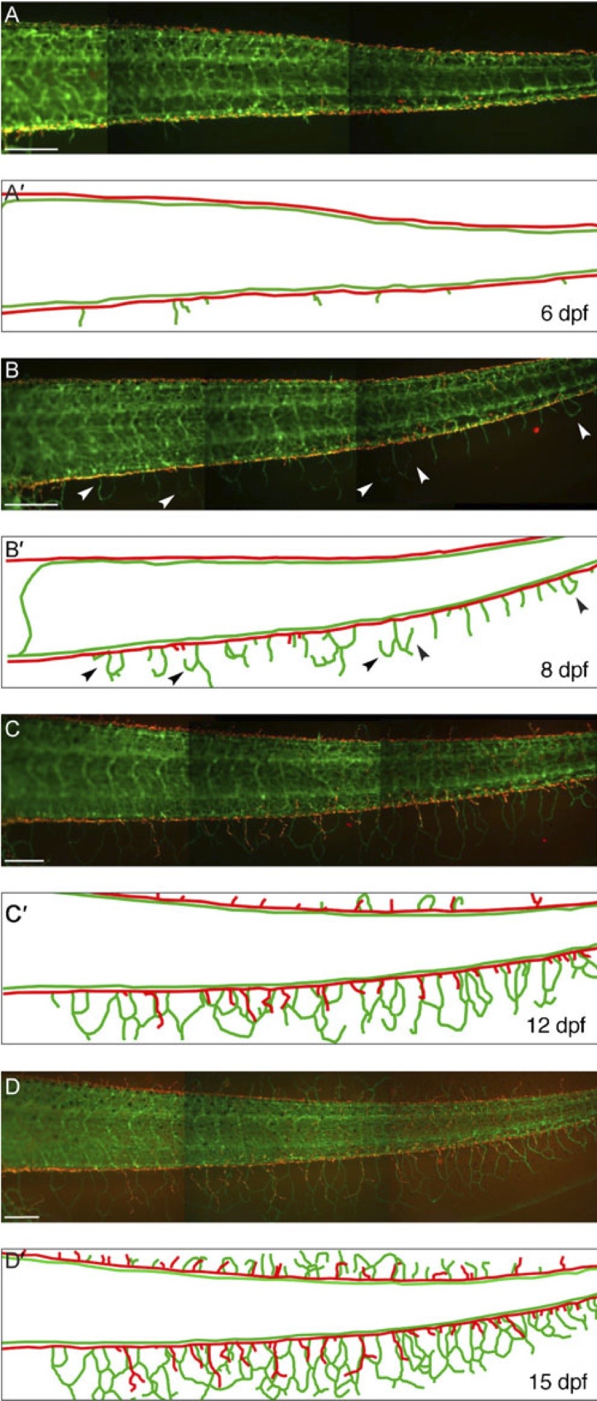 All panels depict lateral views of the tadpoles, head facing left. Each fluorescence picture (A�D) is accompanied by a schematic redrawing of the blood vascular sprouts (green) and lymphatic sprouts (red) (A9�D9). A single tadpole was followed during the indicated stages. (A,A9) First blood vessel sprouting into the ventralfin is seen from stage 46 (6 days post fertilization (dpf)) onwards. (B,B9) Blood vessel sprouting is followed by lymphatic sprouting into the ventralfin, commencing at stage 47. Denoted by arrowheads, already formed blood vessels turning back towards the PCV to form a closed loop (8 dpf). (C,C9) Start of vessel sprouting into the dorsal fin (12 dpf). (D,D9) No or very few new blood and lymphatic sprouts are formed from the longitudinal vessels from this stage onwards (15 dpf and older). Instead, expansion of the dorsal and ventral vascular network depends on the growth of the already established primary sprouts and the formation of new secondary sprouts. Scale bars: 0.5 mm.